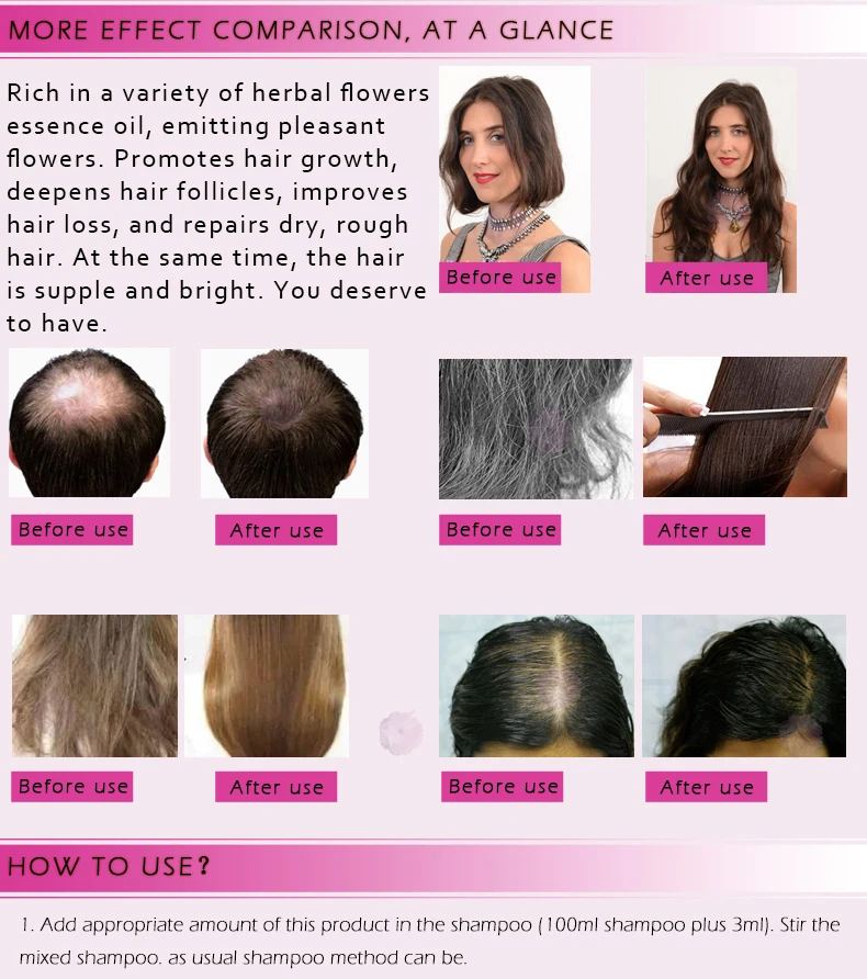 1. Добавьте соответствующее количество этого продукта в шампунь (100 мл шампунь плюс 3 мл). Размешать смешанный шампунь. Как обычно шампунь метод может быть. 2. Можно непосредственно капать 2-3 мл в ладонь, равномерно наносить на волосы. 3. Используется до и после завивки для восстановления повреждения волос, вызванных нагревом. 4. Несколько капель продукта можно смешать равномерно с маской для волос, это даст вам двойное лечение.
