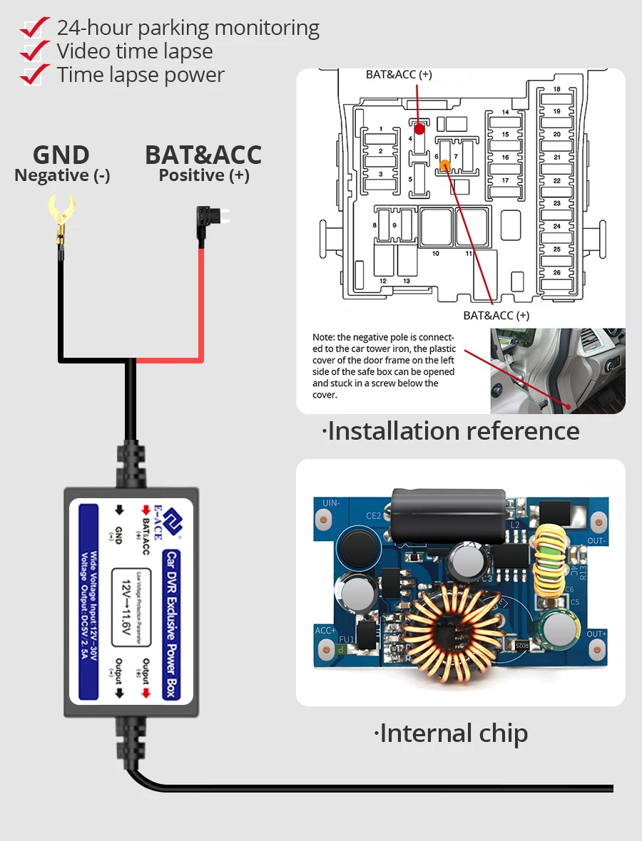 Если вы хотите остановить мониторинг после парковки (видеорегистратор не работает после парковки), подключите положительный полюс понижающей линии к интерфейсу предохранителя ACC.
