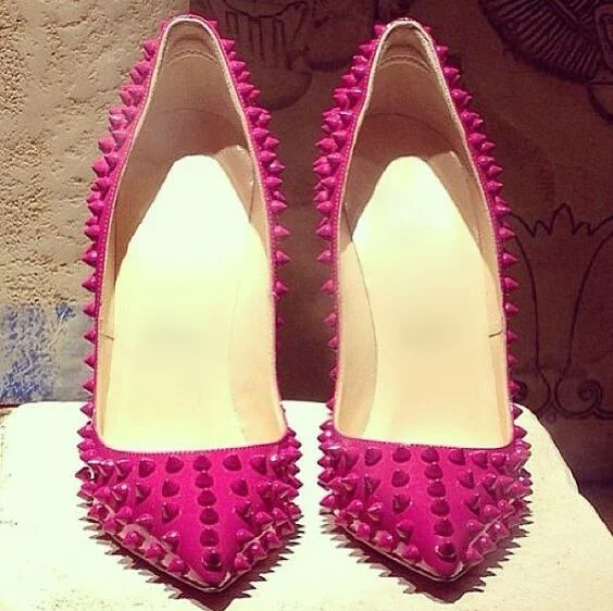 Пикантные розовые туфли с шипами на каблуке, женские туфли с острым носком 12 см, Заклепки Шпильки на каблуке, Weddin...