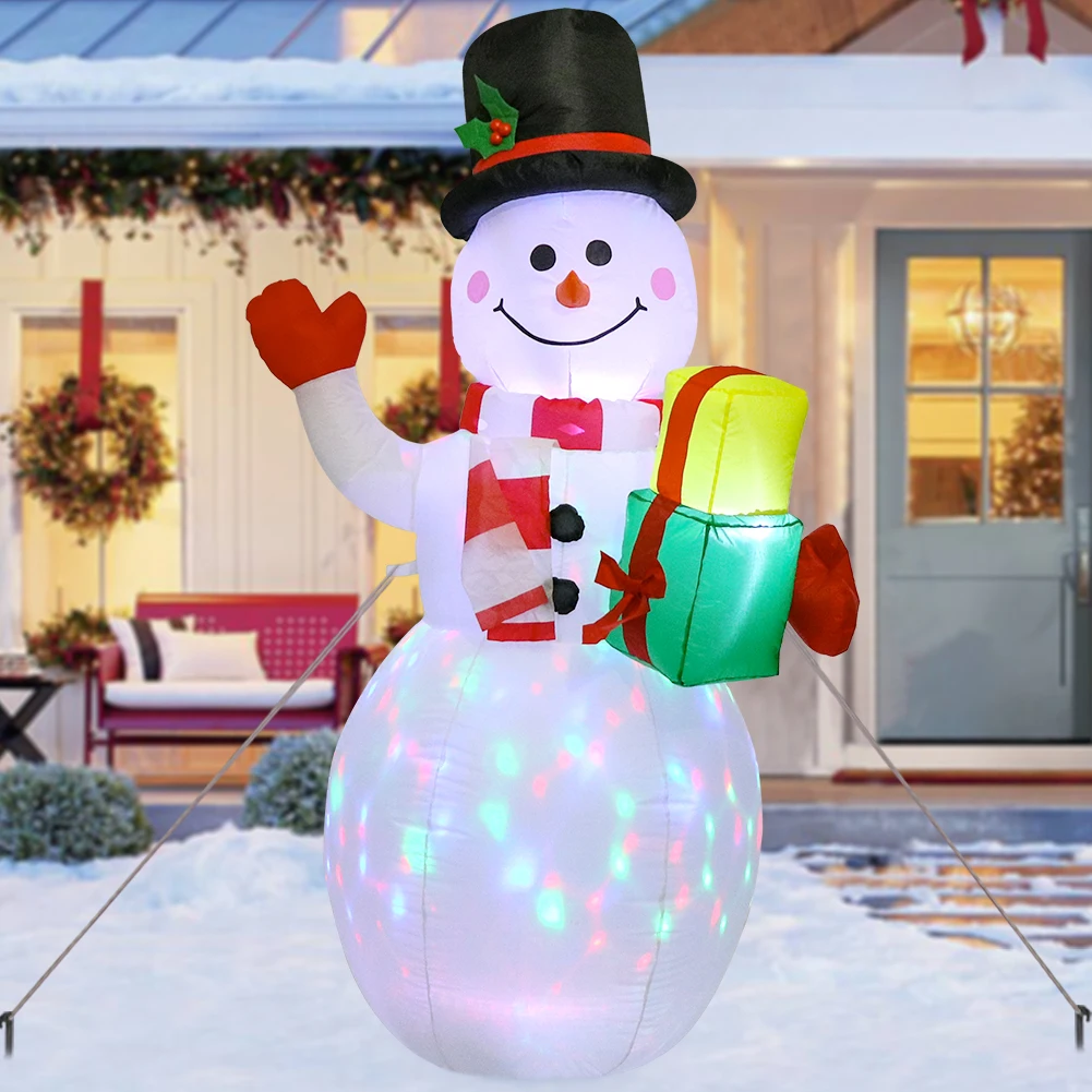 ❤Забавные рождественские садовые украшения: стоит впечатляюще на высоте 5 футов при надувании. Милый надувной Рождественский Снеговик, держащий подарки, передай привет, пусть ваши дети и гости будут визжать с удовольствием ❤Обновление вращающийся светодиодный свет: 3 супер яркий цветной Вращающийся светодиодный свет, встроенные внутри крупного плана украшения для улицы. Обязательно загорит ваш газон или сад и превратит ваш дом в зимнюю страну чудес ❤Прочное качество: Изготовлен из высококачественного полиэстера, устойчив к атмосферным воздействиям и выцветанию. Оснащен мощным водонепроницаемым встроенным вентилятором, просто подключите к розетке и через несколько секунд вы будете иметь милый светящийся Снеговик надувной ❤Обеспечьте песочницы и веревку фиксации: он поставляется с 4 кольями и тросами для быстрой и легкой установки, и 2 фиксированных песочницы, чтобы сделать его стоять без поддержки. Не нужно беспокоиться, что это Рождественское украшение снеговика улетит от ветра ❤Идеальные надувные рождественские уличные садовые украшения (наш теплый профессионал во всех видах товаров для вечеринок. Любая проблема, просто напишите нам, мы всегда поддерживаем ваш 100% удовлетворенный сервис.)