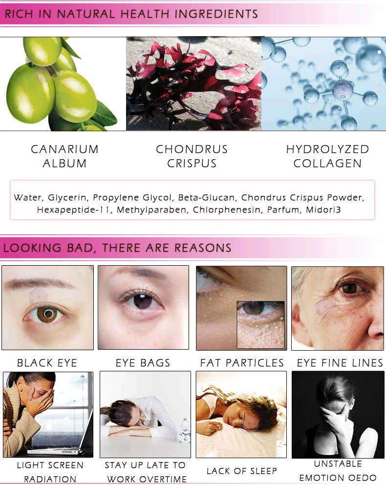 Содержит богатый натуральный экстракт оливы, который успокаивает и питает кожу вокруг глаз, дополняя питание глаз. Кристально чистая пленочная паста, близкая к коже вокруг глаз, текстура освежает и комфортна, которая эффективно фиксирует влагу кожи, выравнивает тон кожи, приподнимает кожу вокруг области вокруг глаз и создает гламурную мышцу вокруг глаз.