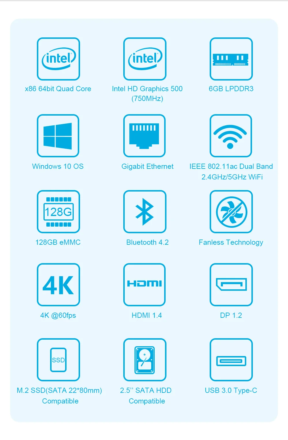 Процессор и ОС ЦП: Intel Apollo Lake Celeron J3455 (1,5 ГГц ~ 2,3 ГГц) (четырехъядерный) Графика: Intel HD graphics 500 Операционная система: Предустановленная Windows 10 Pro (64-битная) ; Поддержка Linux, Ubuntu Язык: предустановленный английский, испанский, русский, французский, немецкий, итальянский, португальский, польский и т.д.; Поддержка 100 языков Биос: поддержка Wake on LAN/PXE/биос одношаговый сброс/автоматическое включение Коробка для хранения Память: 6 ГБ LPDDR Хранение: 128 ГБ eMMC встроенный Расширение хранения: Поддержка M.2 SSD (SATA) до 2 ТБ, 2,5 ''HDD/SSD до 4 ТБ I/O Технические характеристики 3x USB 3,0, 1x usb type-C 1x HDMI 1,4, поддержка 4K @ 30 Гц 1x DP 1,2, поддержка 4K @ 60 Гц 1 х 3,5 мм аудио комбо Джек 1x SD слот для карт памяти 1x Gigabit LAN Порты и разъёмы 1x Мощность кнопка 1x DC Мощность Порты и разъёмы Беспроводной соединение 802.11a/b/g/n/ac двухдиапазонный Wi-Fi (2,4 ГГц/5,8 ГГц) и Bluetooth 4,2