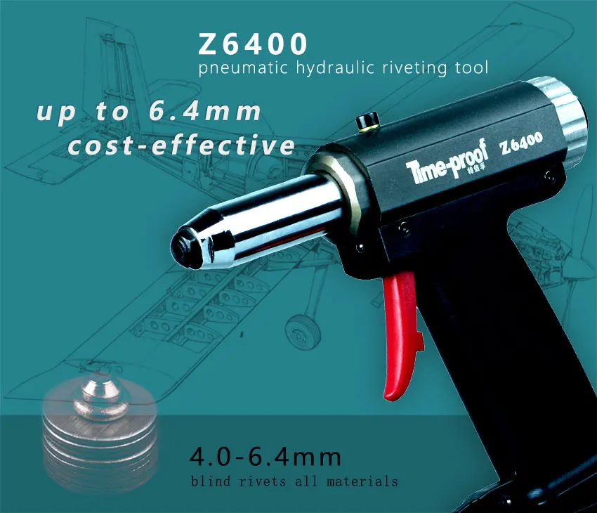 Пневматический Клепальный Инструмент для 4,0-6,4 мм слепые заклепки.Мощный и высокоскоростной и экономичный.Подача воздуха: 5bar-7bar (0.5Mpa-0.7Mpa)