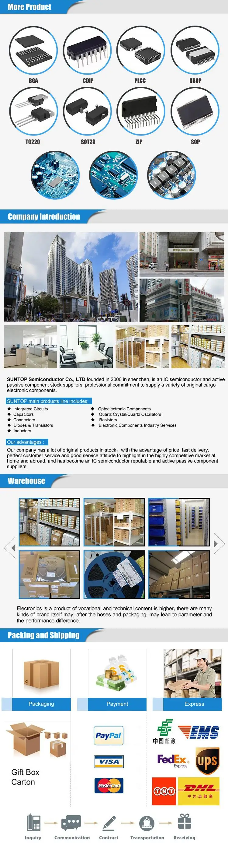 Сфера деятельности: Авто IC, цифровая аналоговая схема, микрокомпьютер с одним чипом, фотоэлектрическое соединение, хранение, трехклеммный регулятор напряжения, SCR, полевой эффект, Шоттки, реле, резисторы конденсаторы, световая трубка, разъемы и другие услуги по поддержке!