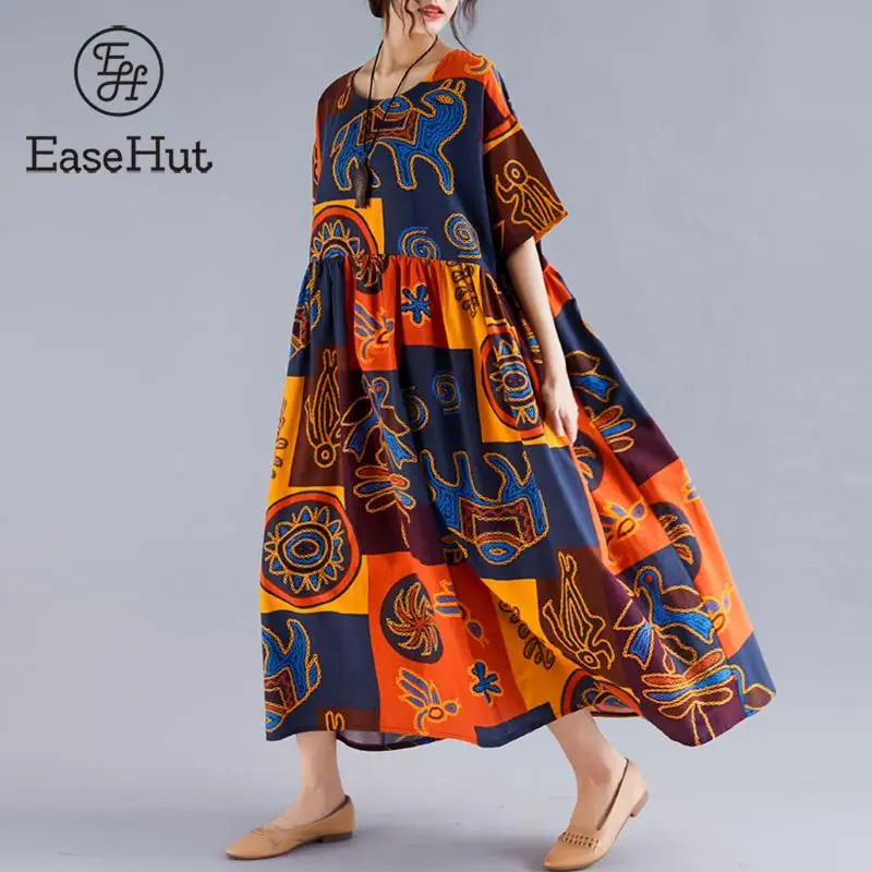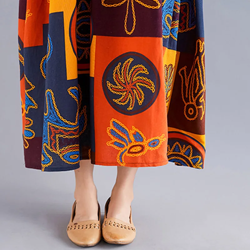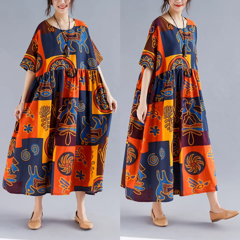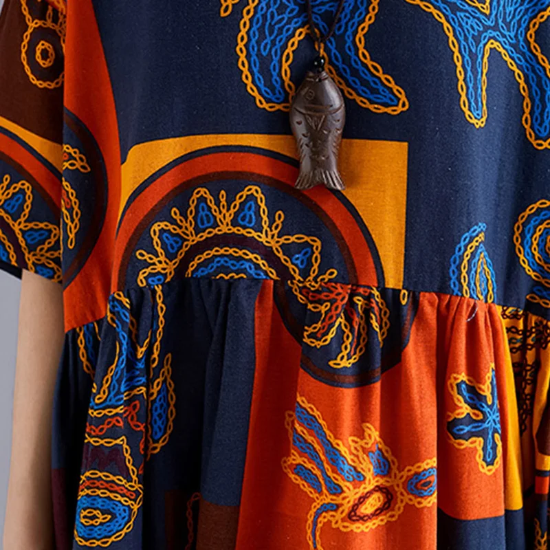 С хлопковой и льняной тканью, контрастным цветным комбинированным принтом, открытыми плечами, полурукавами, свободным силуэтом трапециевидной формы и плиссированной талией, это платье в винтажном стиле удобно носить и дарит ощущение ретро и расслабления. Возьмите его в свой гардероб.
