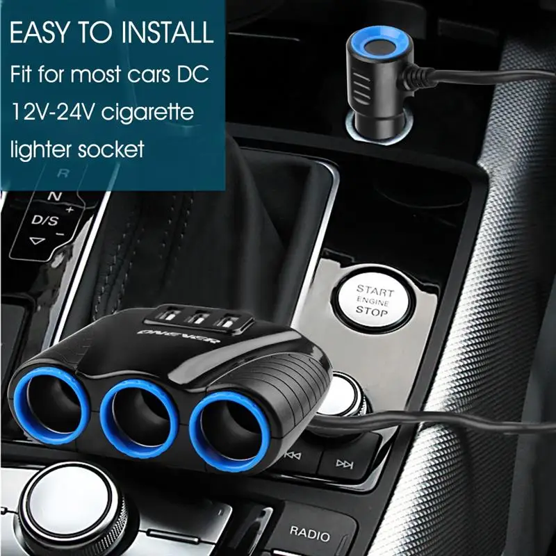 1 to 3 car cigarette lighter socket with 3 USB output, designing integrative and more convenient to use. 3 USB charger output up to 5V/3.1A, suitable for cellphone, GPS, iPod, pad, etc. Fit for most cars DC 12V-24V cigarette lighter socket. Easy to install, confirm the suitable place to install, do not install in any position obstructs driving and operation of air bag. When the car stop operation for a long time, should take the plug out from the socket of the car to prevent the battery from being runaway. Specification Type : Car cigarette lighter Material : Plastic Quantity : 1pcs Color : Black Interface : 3*USB, 3*Cigarette lighter Input Voltage : DC 12V-24V Output Power Max. 120W USB Output Max : 5V / 3.1A Certification : CE, RoHS Power Cable Length Approx. 65cm / 26" Size 9.2*6.6*3.2cm / 3.6*2.6*1.3" Net Weight 0.11kg / 3.9oz Package Include 1*Car cigarette lighter 1*Fuse