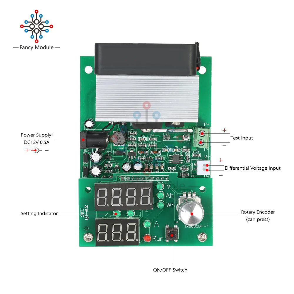 Описание:Этот продукт является профессиональным испытательным оборудованием с двумя режимами: тест на емкость батареи и тест на сжигание источника питания. Он имеет несколько функций защиты, таких как защита от перегрева, защита от обратной полярности и так далее. Он также может автоматически ограничивать ток при превышении максимальной мощности.Характеристика:Два режима тестирования для выбора: Электронный режим нагрузки и режим тестирования емкости аккумулятора.Высококачественный большой радиатор: пыленепроницаемый и стабильный для производительности.Светодиодный дисплей цифровой трубки nixie: прочный и четкий для чтения.Конструкция роторного кодировщика: легко и удобно в эксплуатации.Многоуровневый звуковой сигнал и светодиодный индикатор: с указанием рабочего состояния.Функция автоматического хранения: Можно хранить параметры настройки при выключении питания; Записывать все параметры и состояние после включения питания.Управление вентилятором: интеллектуальное управление вентилятором, бесступенчатая скорость автоматически в зависимости от температуры радиатора.Защита: защита от перегрева, защита от перегрева, защита от перенапряжения, защита от обратной полярности и защита от напряжения питания.Спецификация:Источник питания: DC12V, ток не менее 0,5aРежим работы: однорежимный постоянный ток (CC)Ток разряда: 0,20-9.99A шаговый 0.1A или 0.01AМаксимальный ток разряда. Ошибка: 0.7%-0.01AМакс. Ошибка тестирования Емкости: 0.5A 2.5%, 2A 1,5, 5A и выше 1.2% в автономном режиме (завершение)Напряжение диапазон: 1,0-25,0 V шаговый 1V или 0,1 VНапряжение разряда: 1,00-30,00 ВМакс. Ошибка измерения напряжения: 0.8% (+/-) 0,02 вМакс. мощность: 60 Вт (автоматически ограничивают ток в тех случаях, когда превышает Макс. мощность, например, он может открыть 9.99A на 6V; Открыт только 3.00A под углом 20V)Тест на батарею ограничение: 999.9Ah или 9999WhРазмер вентилятора: 50*50*15 ммОбщий размер: 105*70*55 ммВес изделия: 175 г/6,2 унцийИнструкция по эксплуатации:1. Настройка режимов (по умолчанию электронный режим нагрузки):Нажмите кнопку start-stop и включите тестер одновременно, пока не отобразится «Fun *», а затем отпустите кнопку; Повернув ручку, чтобы изменить настройки, "Fun1" для электронного режима нагрузки и "Fun2" для режима тестирования емкости аккумулятора. Нажмите кнопку один раз для ввода настройки зуммера, также путем вращения ручки для установки «bEon» (открыть зуммер) или «bEoF» (закрыть зуммер). После завершения настройки нажмите кнопку снова, чтобы перезапустить тестер.2. Электронный режим нагрузки:* Подключите к DC 12 В и введите электронный режим нагрузки, обеспечивая в остановленном состоянии («RUN» не светильник, в противном случае нажмите кнопку start-stop, чтобы выключить нагрузку), подключите источник питания под тестом к тестовому входному порту (P +/P-). Пожалуйста, обратите внимание, чтобы не подключать неправильную полярность!* Установите ток и низкое напряжение на ручке, поверните ручку, чтобы установить значение настройки тока, затем нажмите кнопку, чтобы изменить цифру настройки, может подтвердить положение установки через двузначные индикаторы между трубками nixie и индикаторами V/A в правой стороне.* Нажмите кнопку start-stop, нагрузка начинает работать и «run» загорается; Цепь применяет настройку тока разряда для проверки мощности, В то время как верхняя часть отображает фактическое входное напряже