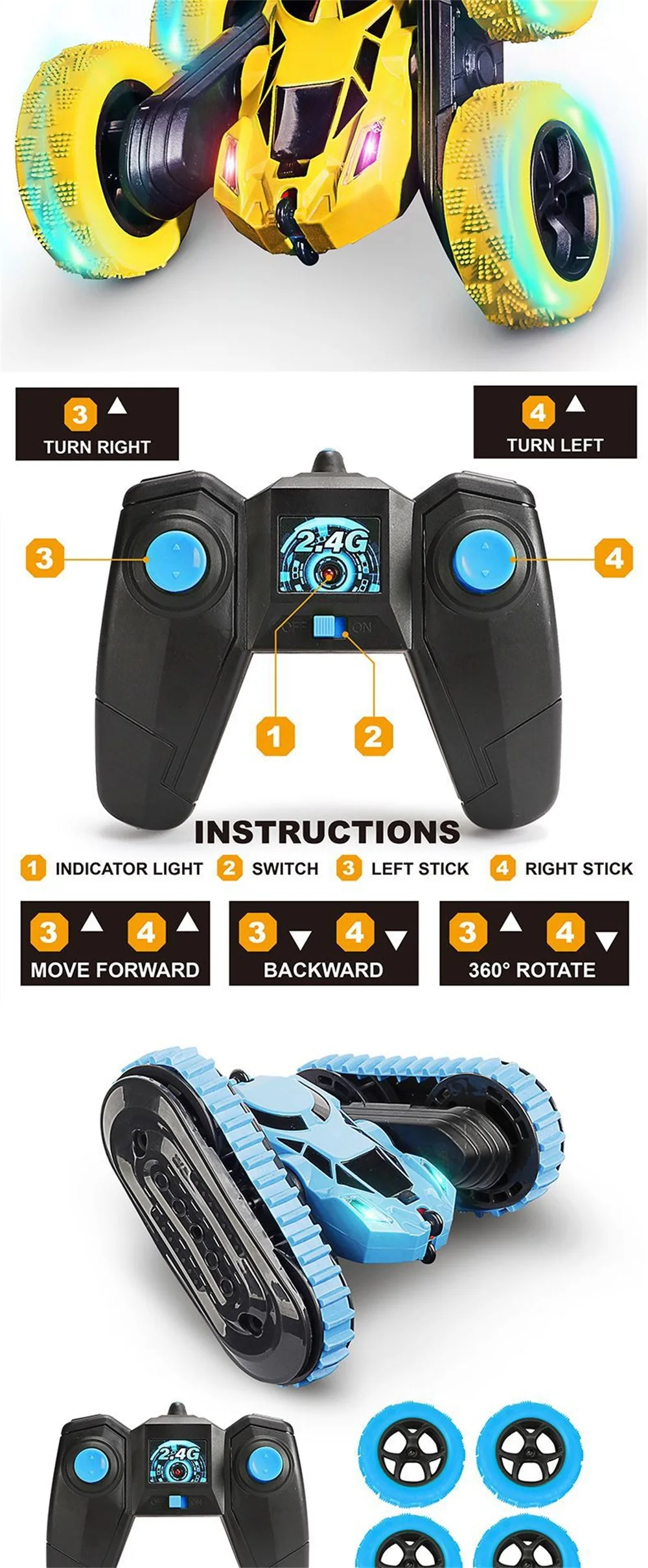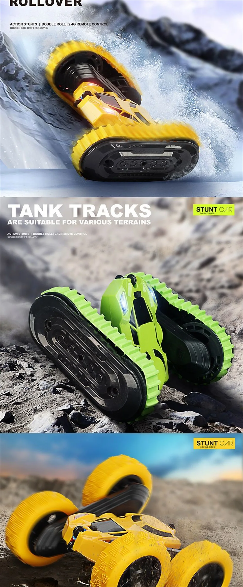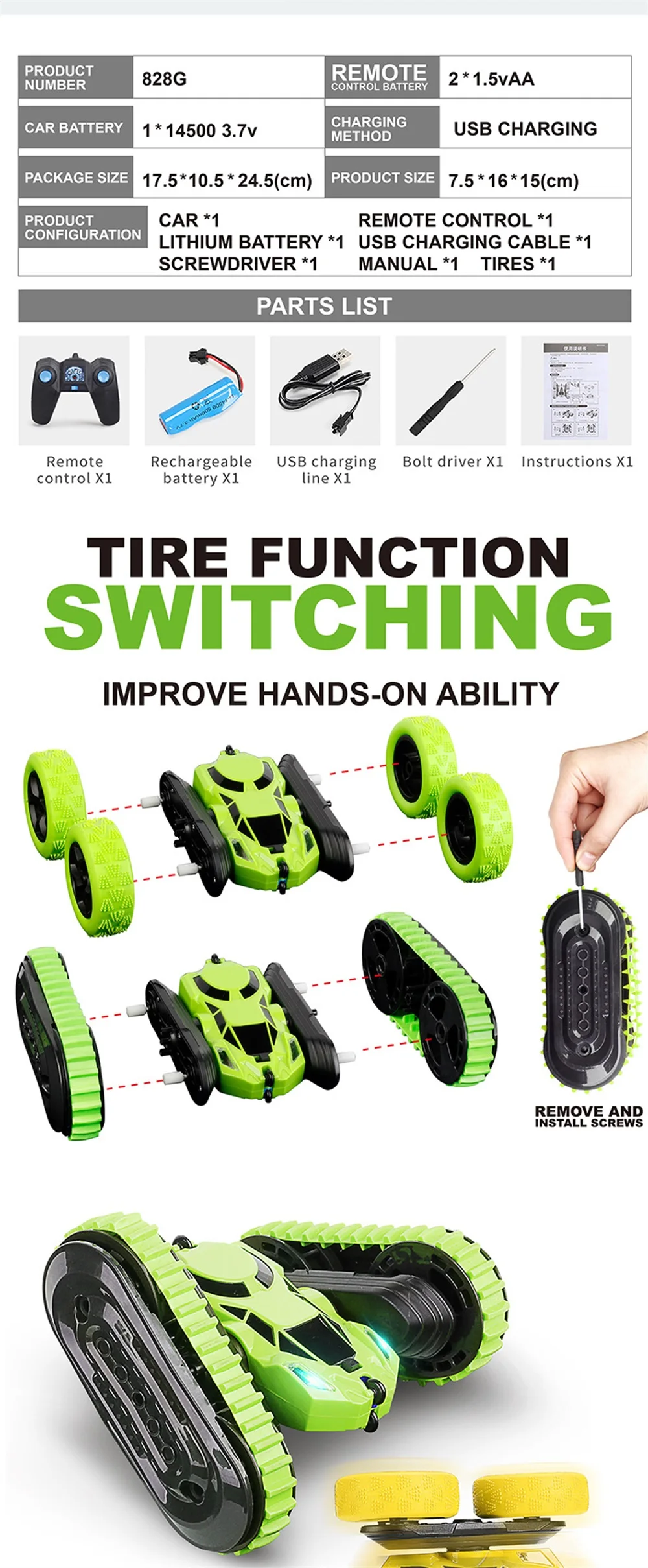1. Автомобильный пульт изготовлен из высококачественного АБС-пластика, нетоксичного, безвкусного и экологически чистого распылителя. 2. Благодаря уникальному дизайну он выглядит как настоящий гоночный автомобиль. Колесо изготовлено из резины, поэтому имеет хорошее сцепление, ударопрочность и долговечность. 3. RC stunt автомобилей принимает 2,4 ГГц с поддержкой технологии несколько высокоскоростных транспортных средств с длинная Дистанция управления и сильная способность анти-помех. 4. Может переключаться между треками танка и колесами, несколько способов воспроизведения Характеристики: Наименование товара: 2-в-1 stunt автомобилей Размер изделия: 16*15*7,5 см Посылка Размер: 24,5*17,5*10,5 см Время зарядки: 1,5 часов Время работы: около 20 минут Пульт дистанционного управления батареи: 2*1,5 V AA батарея Автомобильный аккумулятор: 1*14500 3,7 V