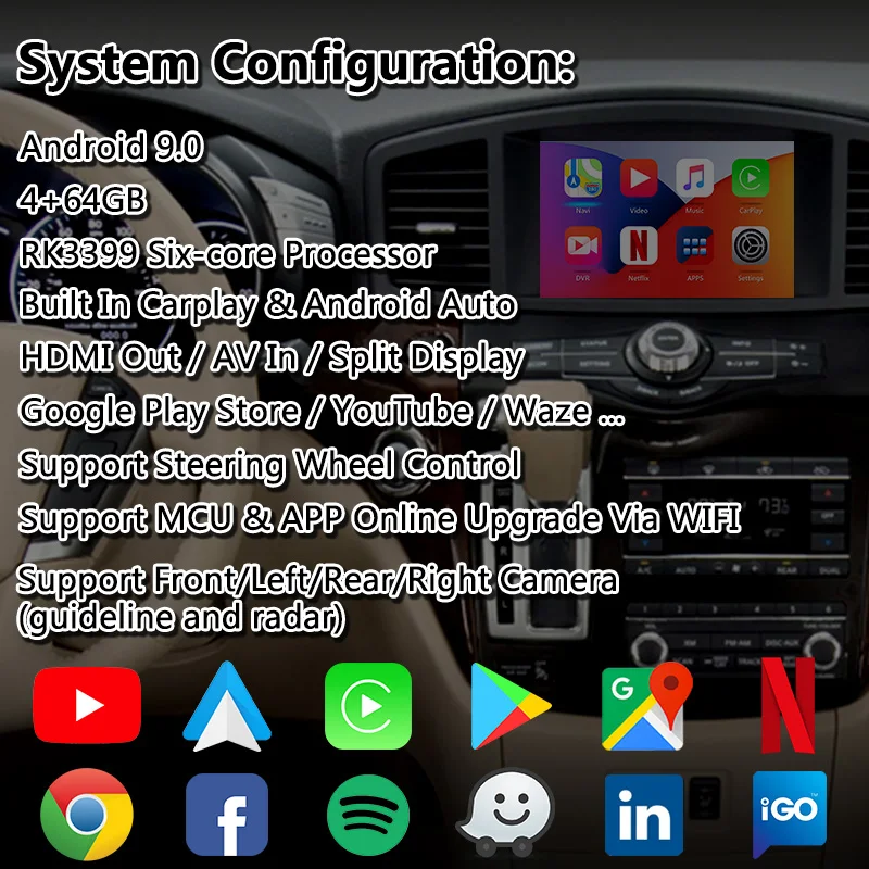 Процессор: гекса-Core процесс: двухъядерным процессором ARM Cortex-A72 1,8 ГГц и Quad-core ARM Cortex-A53 1,4 ГГц ОЗУ: 4 Гб LPDDR4 ROM: 64 Гб EMMC ОС: Android 9,0 Дисплей: LVDS цифровой Wi-Fi: IEEE802.11b \ г \ n 2,4 ГГц BT: BT5.0 поддержка звонков, музыки и даты OBD MirrorLink: Android 10 и IOS 14 CarPlay/Android авто: проводной и беспроводной CarPlay/проводной Android авто Хикар: Да Play Store: Да YouTube: Да Выбор пользовательского интерфейса: 5 комплектов на выбор DSP : 256 DSP чип, с 16 период эквалайзера DSP чип, регулируемый император, и т. Д.