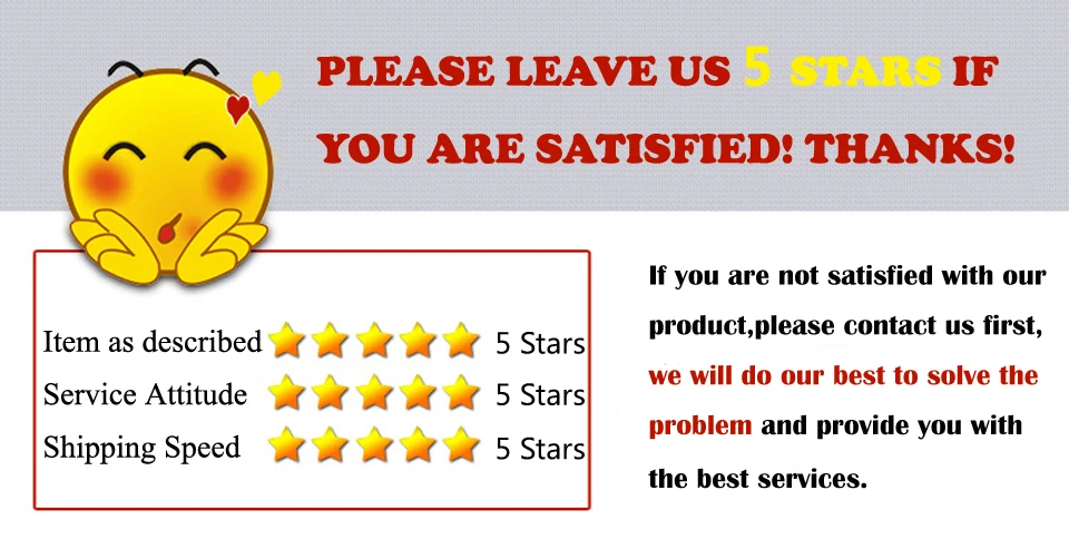 1. Если вы удовлетворены нашими товары и услуги, пожалуйста, оставьте нам 5 звезд отзывы.