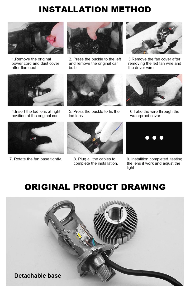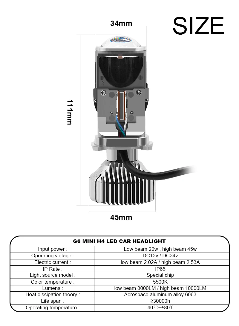 Важные параметры 1. Напряжение: DC12V-24V 2. Мощность: ближний свет 20 Вт, дальний свет 45 Вт 3. Люмен (яркость): ближний свет 8000 лм, дальний свет 10000 лм 4. Цветовая температура (цвет): 5500K 5. Срок службы: >30000 часов 6. Чип: специальный чип 7. Уровень водонепроницаемости: IP65 8. Охлаждение: без вентилятора 9. Тип розетки: H4 10. Рабочая температура:-40-80 ℃ 11. Гарантия: 1 год 12 посылка: лампочки 2шт в одной коробке 13. Материал: Аэрокосмический алюминиевый сплав 6063 Все наши товары поставляются в розничной упаковке
