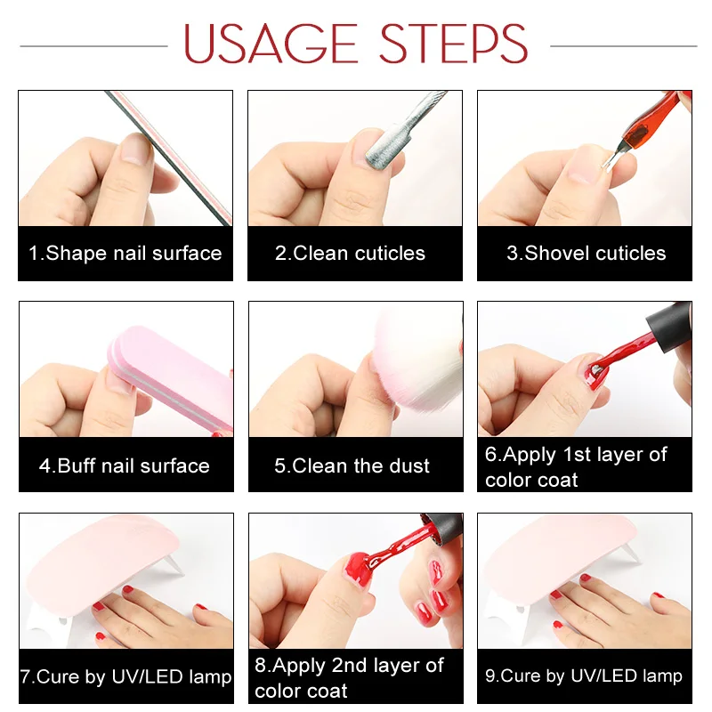 -Type: Soak-off UV Gel Polish, no need to use with top base coat, cure by UV LED Lamp