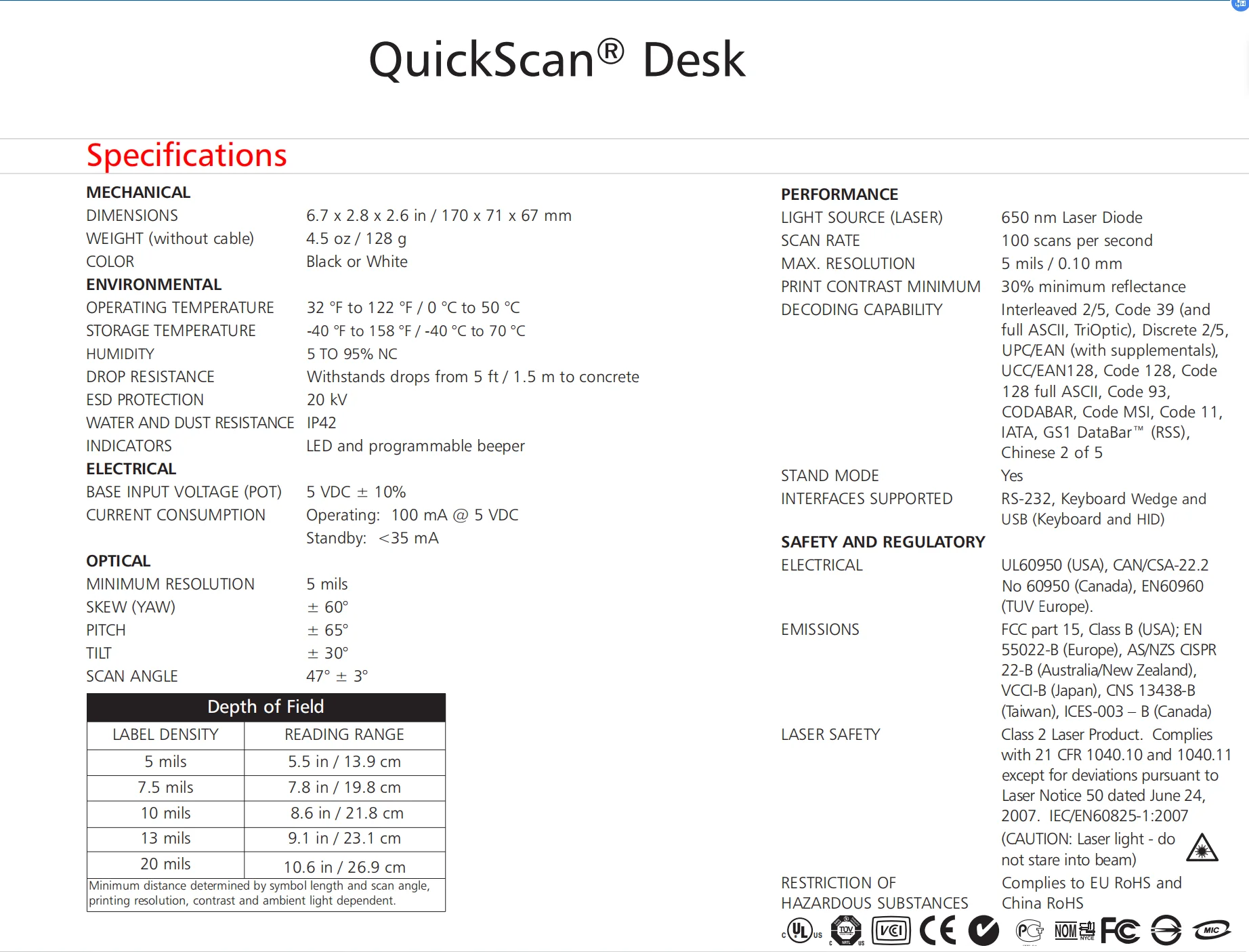 * Light Weight Scanner: 4.5 oz / 128 g * Multiple Interfaces: Keyboard Wedge, RS-232 and USB * Available as a ‘Plug & Play’ Kit: Kits include: a scanner (white or black), an interface cable and a ‘hands-free’ stand * Gooseneck Stand Available: Allows the customer the option of using the scanner in a hands-free mode (available in white or black)