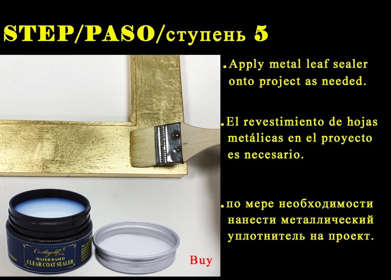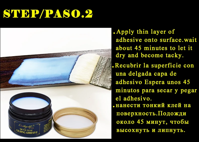 2. С помощью кисти нанесите на поверхность тонкий ровный слой позолоченного клея. В зависимости от вашего профиля Вы можете нанести до 30% воды, чтобы растянуть клей для нанесения. Наносите клей только на области, которые вы собираетесь покрыть металлическим листом. Дайте высохнуть в течение 15 минут или пока клей не станет прозрачным. (Для традиционной отделки Нанесите базовый слой красной или терракотовой краски, перед нанесением позолоченного клея)