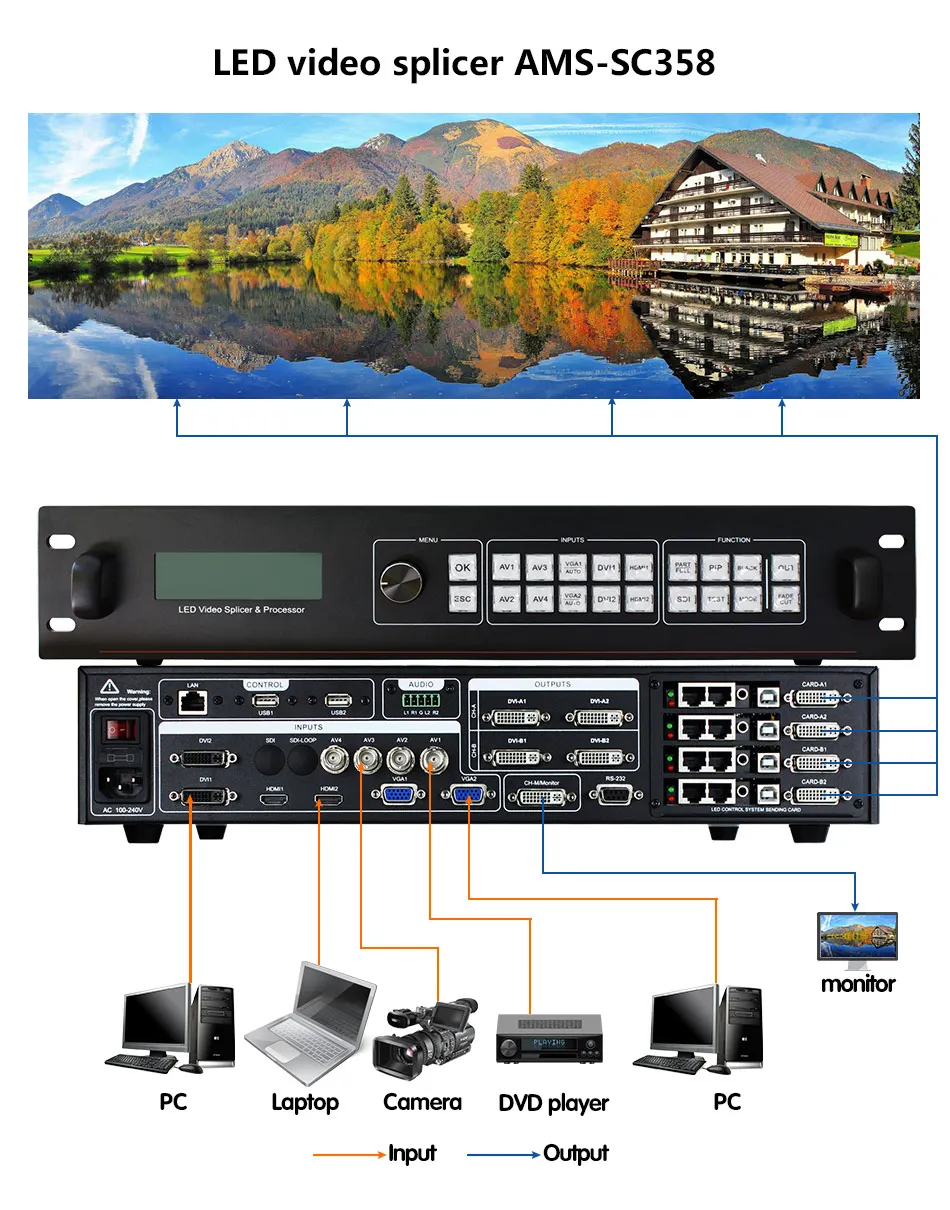 Светодиодный комбинированный процессор может вместить широкий спектр входных источников, может получить доступ до 11 Видео входы, включая 2 DVI, 2 HDMI, 4 видео, 2 VGA и 1 SDI (опционально). Каждый канал может Принимаем стандартные разрешения или видео сигналы высокого разрешения, DVI и VGA могут получать до 1920 × Разрешение 1200 @ 60 Гц, для удовлетворения различных выходов высокой четкости. Комбинированный процессор прост в использовании, с помощью панели клавиш и системы меню для завершения сложного Настройки. Различные входные интерфейсы, для удовлетворения различных потребностей сигнала. Встроенный 4 светодиодный карточка для отправки Место установки для удовлетворения требований к установке системы с большим экраном.