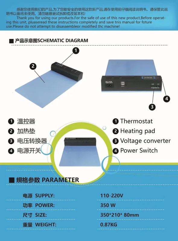 ● The heating separate temperature controller station including thermostat, parts placement, screw batch placement, voltage converter, temperature control switch, and the heating pad.