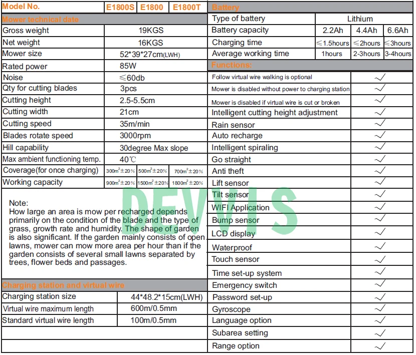 DEVVIS робот Lan косилка E1800 Informaiton:Модель: E1800Бренд: DEVVISКод HS: 8433190000Рабочая мощность: 1500m2 (-20% рекомендуется)Один заряженный: 500 м2 (рекомендуется-20%)Тип батареи: 4.4Ah литийВремя работы за одну зарядку: до 2-3 часовВремя зарядки: менее 2 чНашиМетод зарядки: автоматическая зарядкаМаксимальный допустимый наклон: 30 градусовРазмер косилки: 60 *52*39*27См (LWH)Размер зарядки: 44*48,2*15 смВиртуальный провод Max Длина: 600 м/0,5 ммШум:<60 дБСистема резки:Тип режущего двигателя: щеткаМощность режущего двигателя: 85 ВтРежущее лезвие: 3 шт.Скорость режущего лезвия: 3000 об/минШирина резки: 21 смВысота: 2,5-5,5 смСкорость резки: 35 м/минНавигационная система:Гироскоп: ДаФункция Subarea: 6 областейГрафик скашивания: ДаРежим резки провода по периметру: ДаРежим спиральной резки: ДаРежим прямого кроя: ДаДиапазон Funtion: ДаКоммуникация и интерфейс:Подключение: WIFI (независимо)ЖК-дисплей: ДаУправление приложением: (бесплатные IOS и Andriod)Характеристики безопасности:Защита от кражи: ДаНастройка пароля: ДаДатчик бампера: ДаДатчик подъема: ДаСенсорный датчик: ДаДатчик плитки: ДаАварийная остановка: ДаВодонепроницаемость: IP54Датчик дождя: ДаУпаковка и доставка