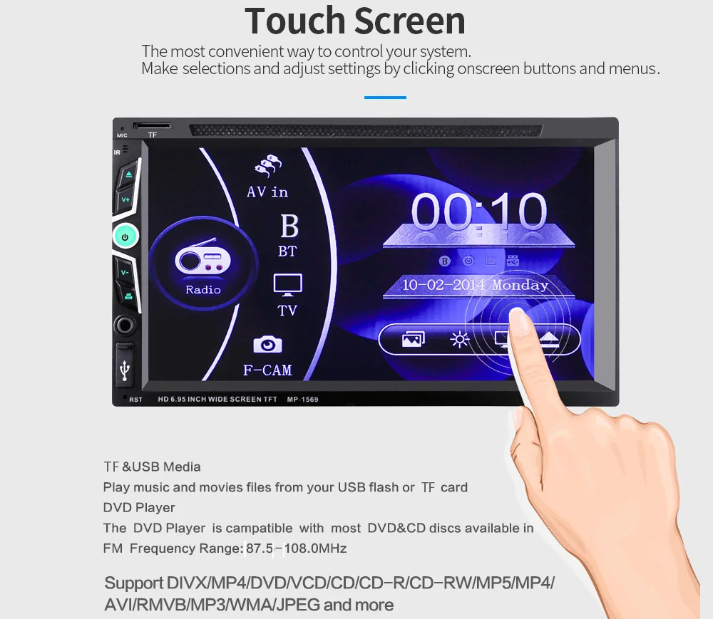 2 Din 6,95 дюймов Bluetooth Стерео DVD CD плеер