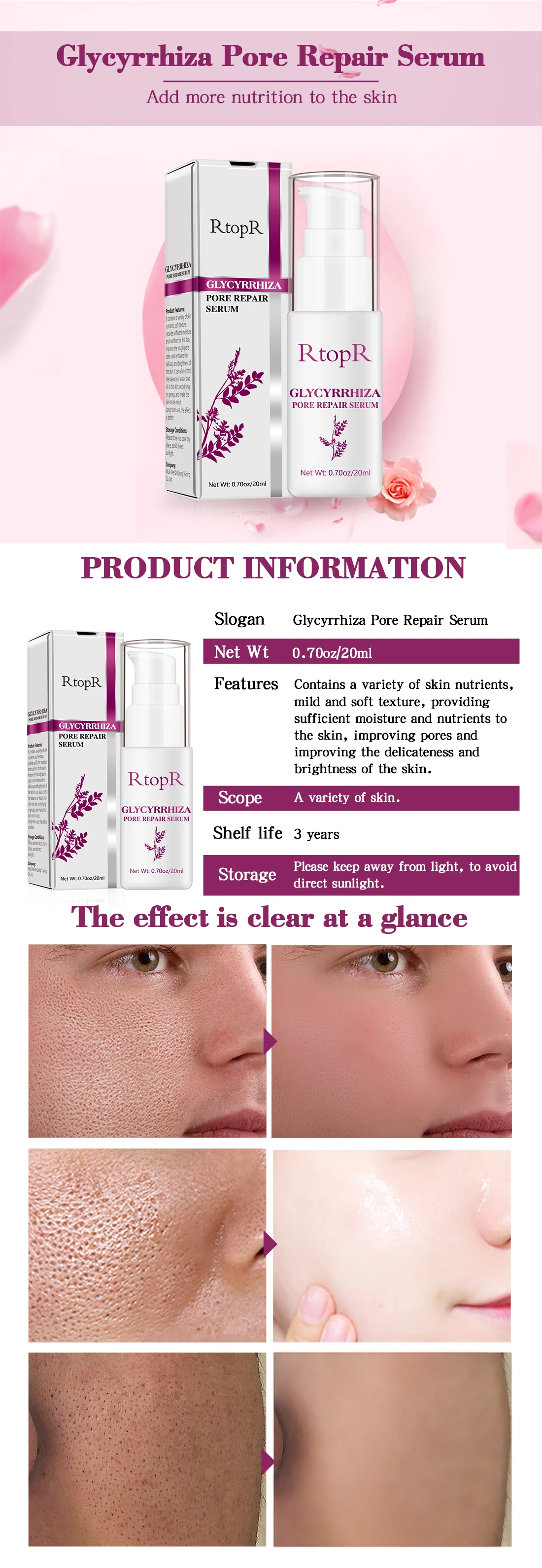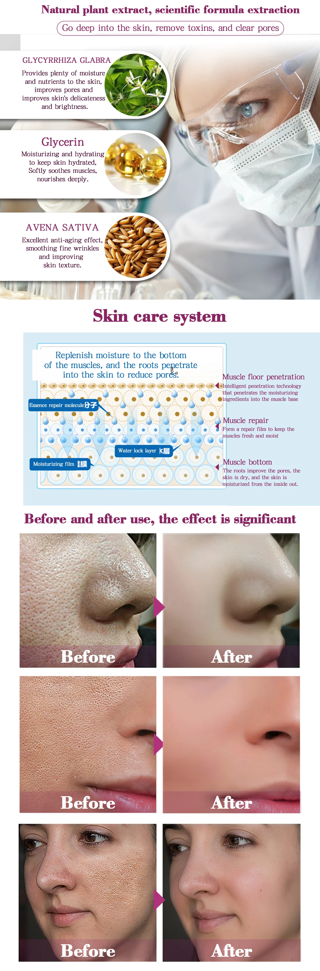 Содержит различные питательные вещества кожи, мягкую текстуру, обеспечивает достаточную влажность и питание для кожи, улучшает огрубевшее состояние пор, а также повышает деликатность и яркость кожи. Он также может контролировать баланс воды и масла в коже, не сушить или жирной, и сделать кожу более влажной. Длительное использование, эффект лучше.