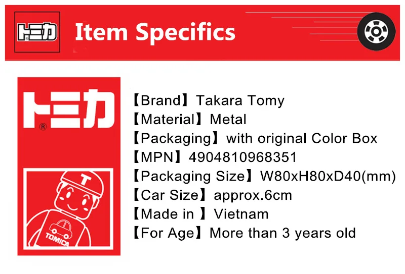 Номер товара. : 4904810968351 Производитель: TAKARATOMY Бренд: Tomica Размер посылка: W78 x H78 x D40 мм Целевой возраст: 3 года ~