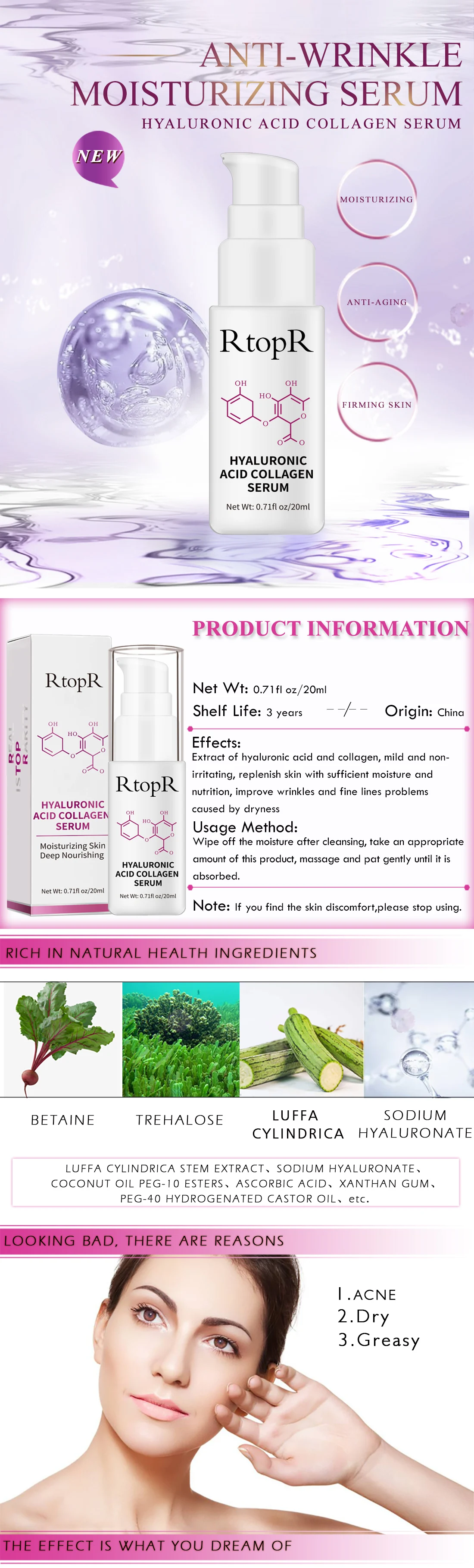 The essence of hyaluronic acid and collagen,gentle and non-irritating,removes wrinkles,tightens skin,replenish moisture, moisturizes skin and makes you look younger
