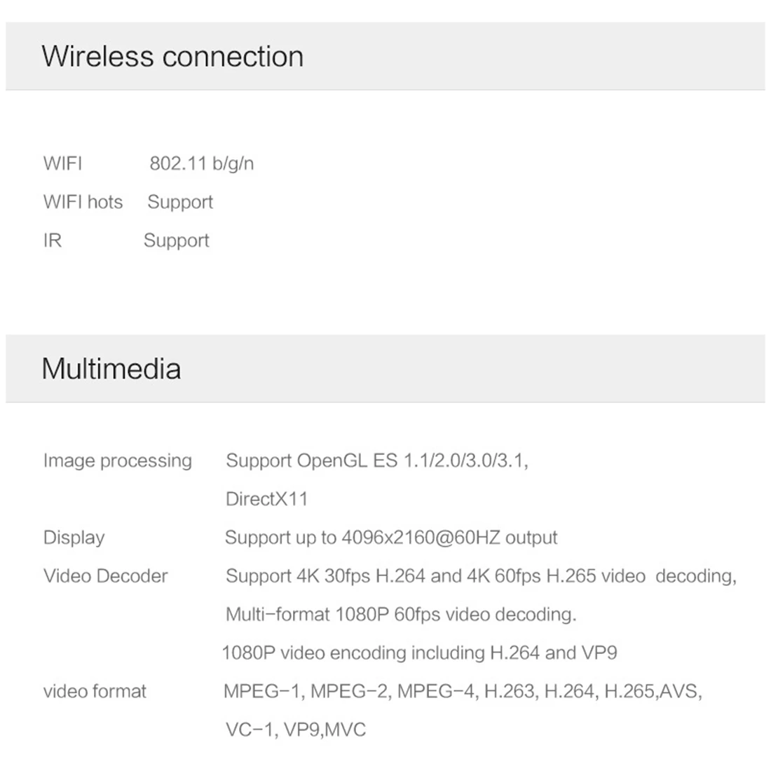 Поддержка вывода 4K HD; 4k 30fps, H.264 и 4k 60fps, H.265 10bit декодирование видео; 1080p 60fps многоформатное декодирование видео; Поэтому каждая деталь экрана ясна; позволяет смотреть фильмы 4K гладко.