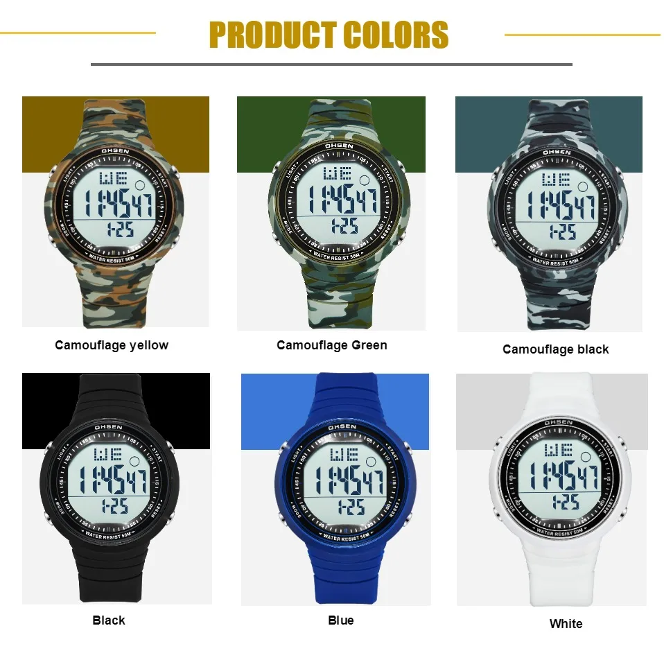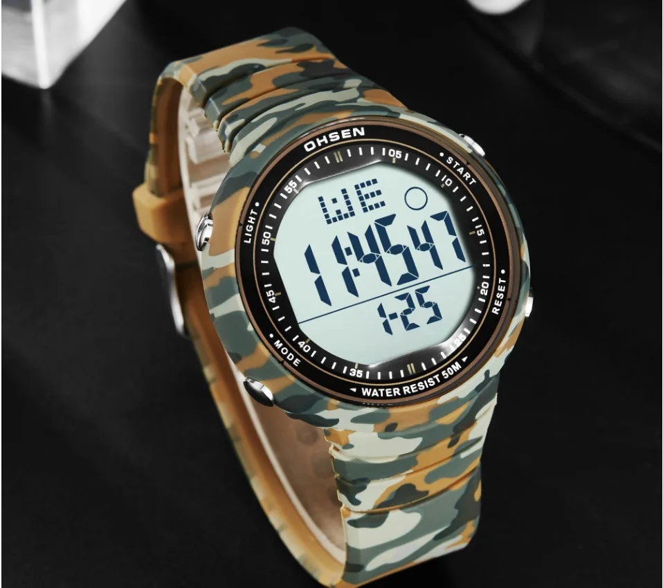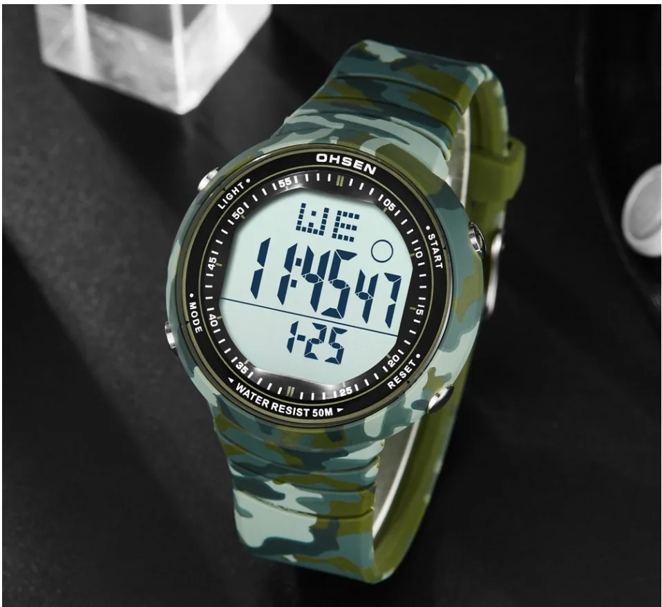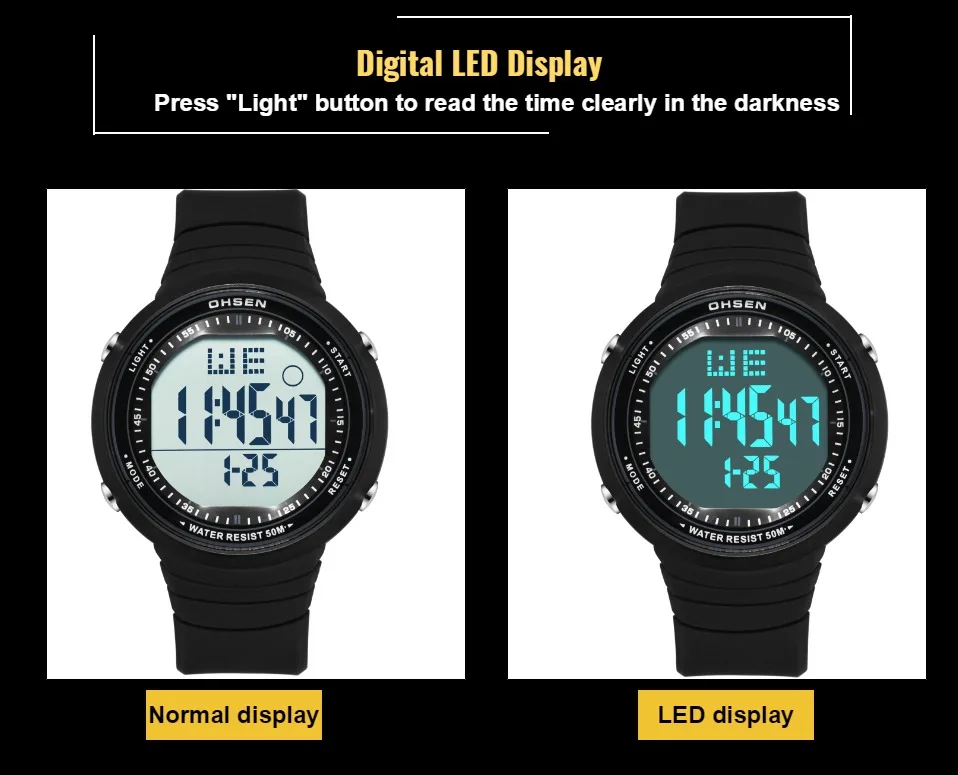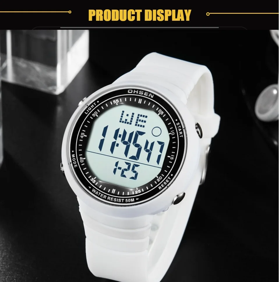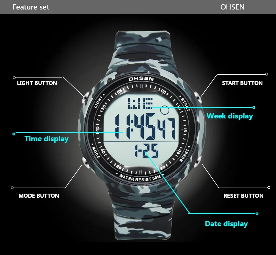Цифровой: часы, минуты, секунды, вечера, месяц, дата, день 12/24 формата отображения времени Будильник и функция ежечасного звонка Специальная конструкция с хронограф (секундомер) при температуре не выше 0,01 второй шаг На водонепроницаемость на глубине до 50 м (не нажимайте кнопки в воде) Дополнительный ЖК-светильник для отображения времени в темноте