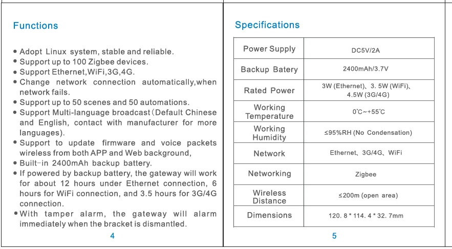7. Встроенный резервный аккумулятор емкостью 2400 мАч, если питание от резервного аккумулятора, шлюз будет работать около 12 часов undeer Ehernet, 6 часов для wifi соединения, И 3,5 часов для 3G/4G-соединение.