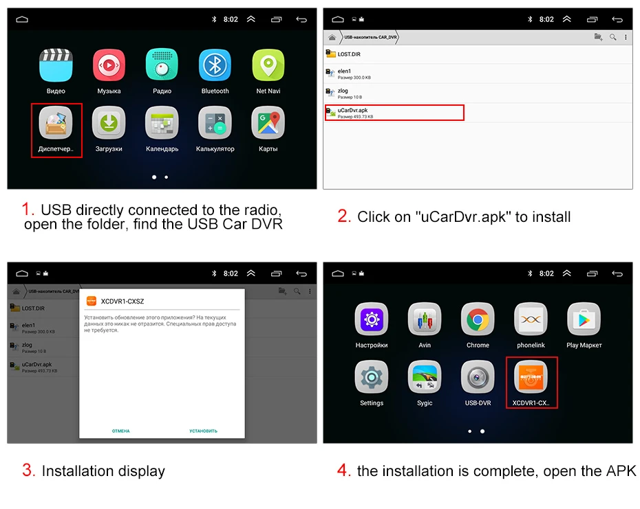 Мы переустановили приложение в dvr, просто подключите к вашему автомобильному радио, введите файловый менеджер, найдите файл «uCardvr.apk», установите его, а затем закончите;