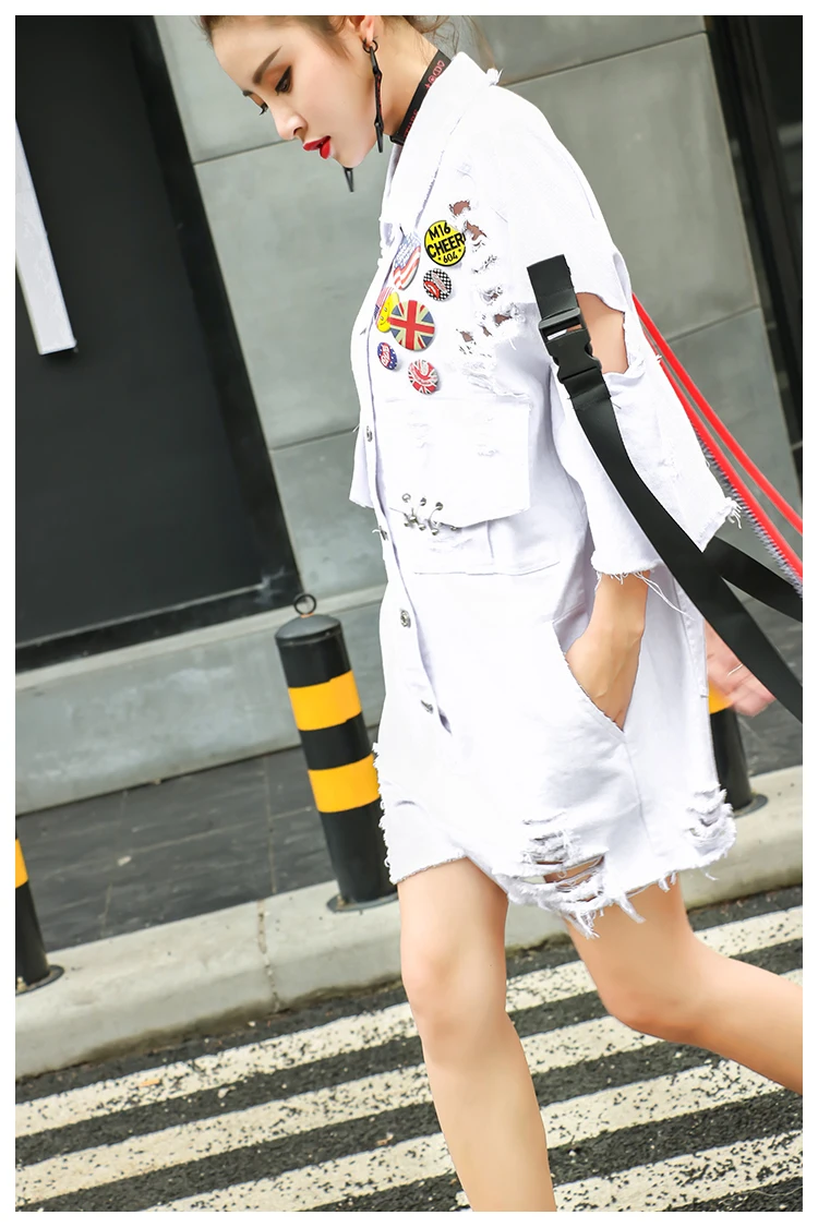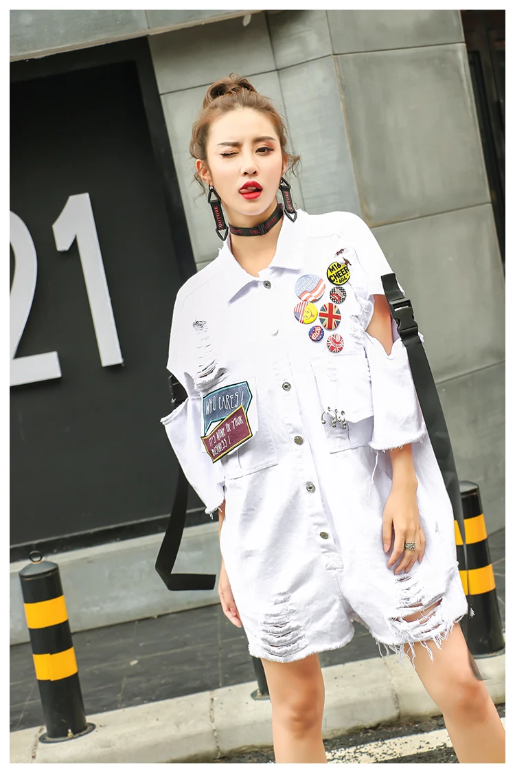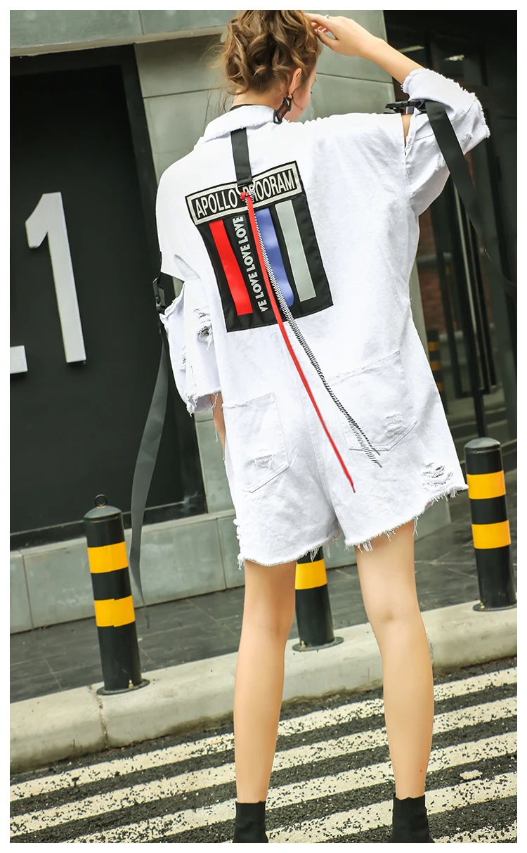 Vefadisa White Cowboy Jumpsuits Women Holes Jeans Bodysuit Buckle Short Sleeve One Piece Pants Letter Denim Playsuits ZLD847