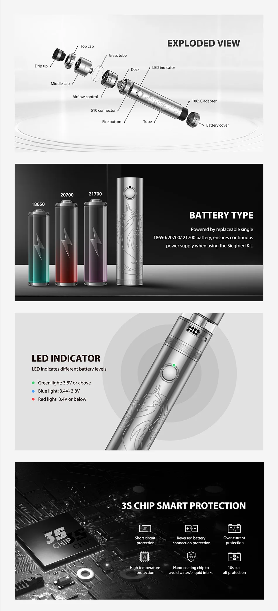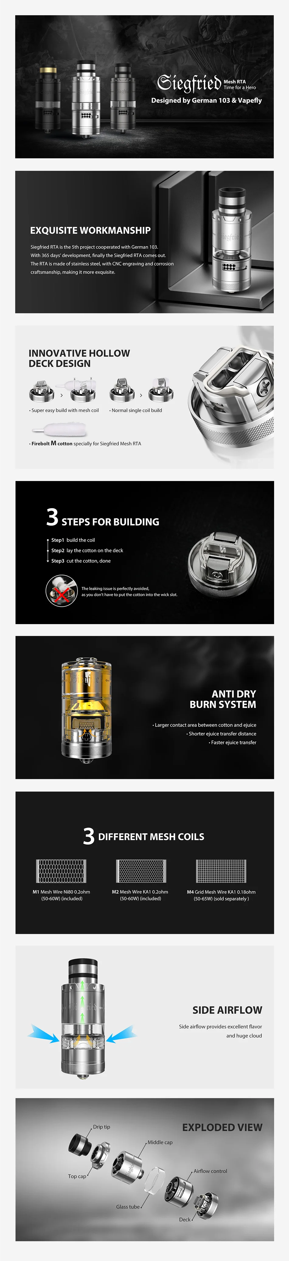Vapefly Siegfried состоит из зигфрированной батареи и зигфрированной сетки RTA. Набор Siegfried питается от одного аккумулятора 21700/20700/18650. Зигфрид рта легко построить и фитиль.