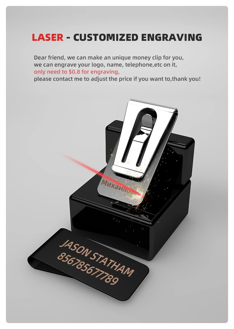 Дорогой друг, мы можем сделать уникальный зажим для денег для вас, вы можете выгравировать ваш логотип, имя, телефон и т. д. на нем, только нужно $0,8-1,6 для гравировки, пожалуйста, свяжитесь со мной, чтобы скорректировать цену, если вы хотите, спасибо!