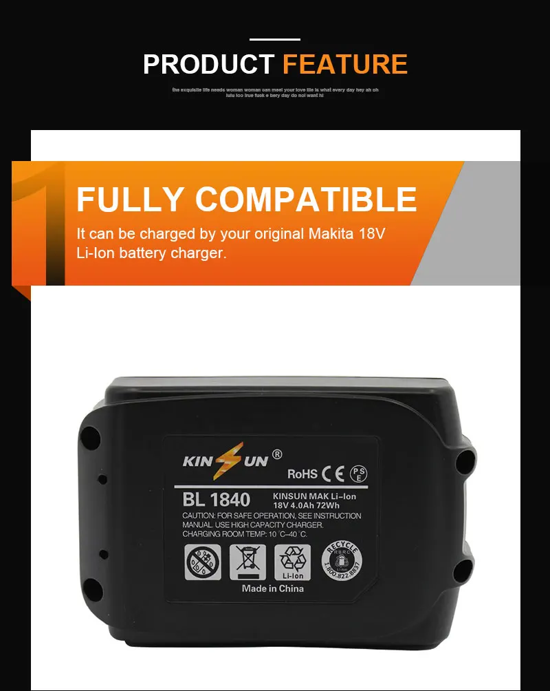 Полностью совместим со всеми оригинальный 18V литий-ионные аккумуляторы Makita. Он может быть заряжен вашим оригинальным литий-ионным зарядным устройством Makita 18V.