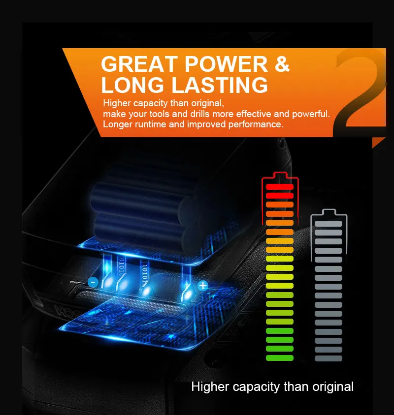 Большая мощность и долговечность: более высокая емкость, чем оригинал, делают ваши инструменты и дрели более эффективными и мощными. Более продолжительное время работы и Улучшенная производительность.