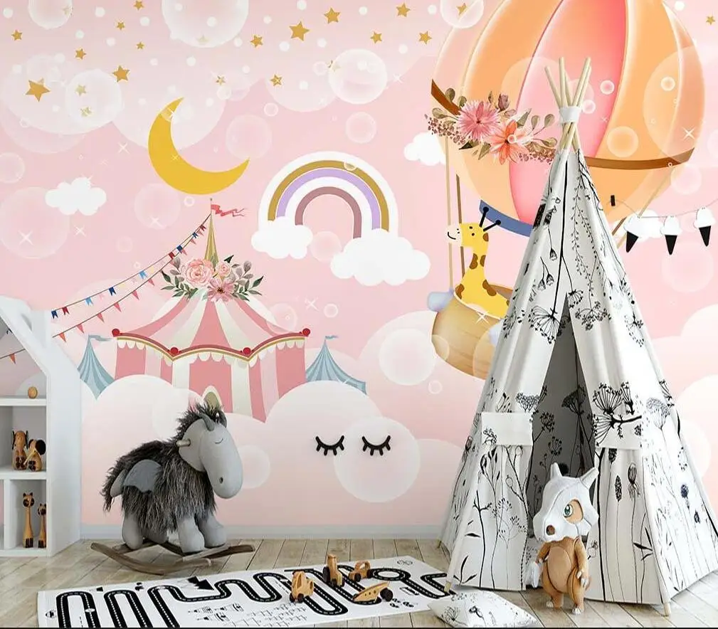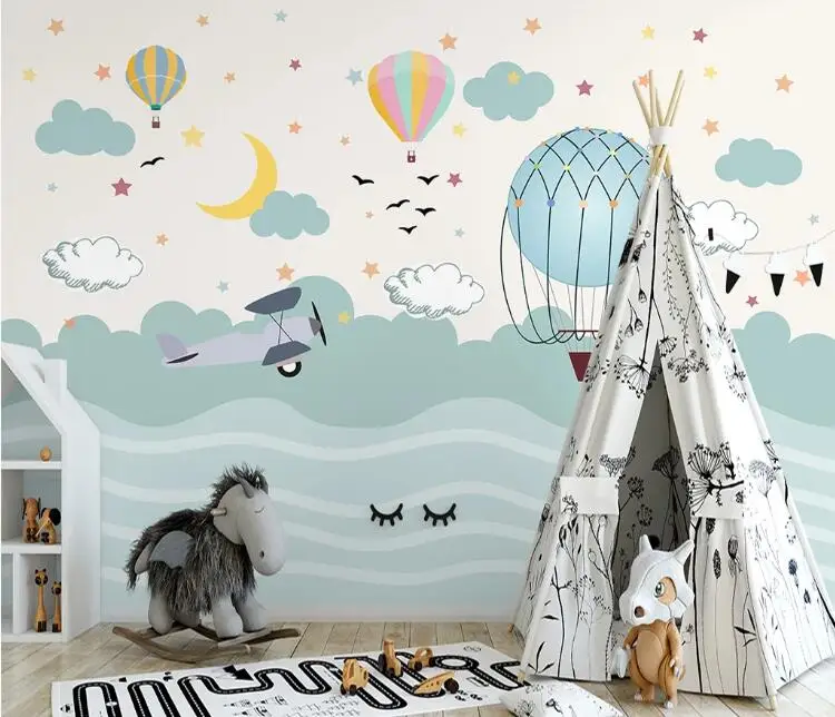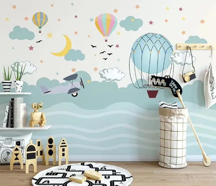 Custom wallpaper photo Nordic hand-painted cartoon hot air balloon starry sky children's room background wall mural 3d | Обустройство