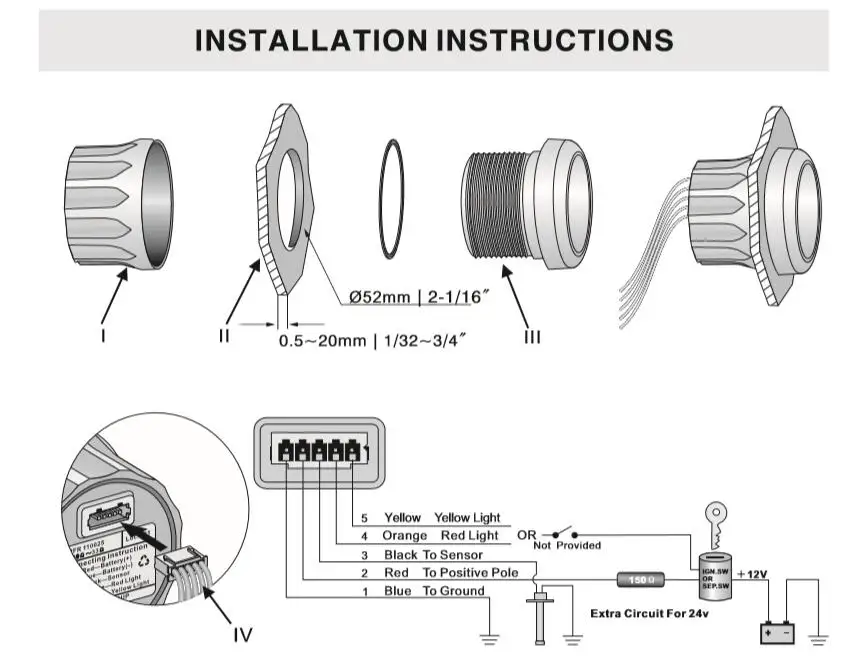 Подключение: красный-аккумулятор (+ 9-32VDC) синий-аккумулятор (-) черный-сигнал оранжевый/желтый-подсветка (+ 9-32VDC)
