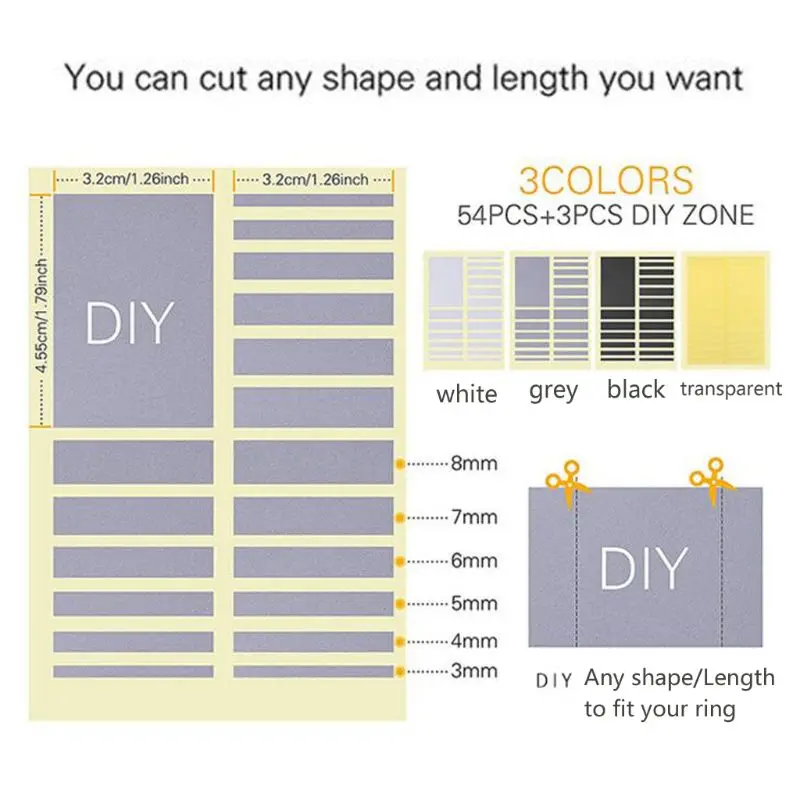 6 размеров регуляторов колец для 3 мм, 4 мм, 5 мм, 6 мм, 7 мм, 8 мм кольцевых браслетов и дополнительных DIY пластырей для большего диапазона колец.