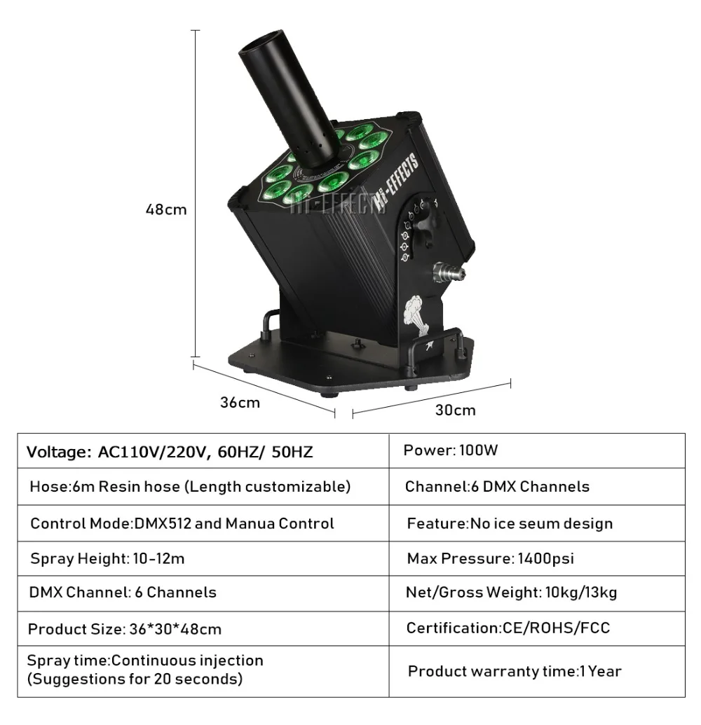 Напряжение: 110 В/220 В, 60 Гц/50 ГцМощность: 100 ВтШланг: 6 м резиновый шланг (настраиваемая длина)Характеристика: без льдаКанал: 6 каналов DMXКлапан давления шланга: 2600 psiРежим управления: DMX512 и ручное управлениеВремя распыления: непрерывная инъекция (предложения в течение 20 секунд)Угол: 0-90 градусов регулируемыйМаксимальное давление: 1400psiВысота распыления: 10-12 мВес брутто: 7 кгВес доставки: 10 кгРазмер изделия: 36*30*48 смDMX имеет 6 каналов, см. Следующее:Канал 1: CO2 спрей (0-255) вкл.Канал 2: светодиодный смешивание цветов, (0-255) светодиодный смешивание цветов.Канал 3: светодиодный синий, (0-255) Светодиодный индикатор постепенно загорается.Канал 4: светодиодный зеленый, (0-255) Светодиодный индикатор постепенно загорается.Канал 5: светодиодный красный, (0-255) Светодиодный индикатор постепенно загорается.Канал 6: светодиодный стробоскоп, (0-255) становится быстрее.Устанавливает иллюзию:1. Поместите большую колонку CO2 в соответствующее положение2. Подключите шланг C02 к газовой бутылке3. Положите бутылку и держите ее в форме4. Подключите машину к газовой бутылке через шланг, шланг с одной стороны соединяется с баком, другая сторона соединяется с машиной5. Включите клапан газовой бутылки6. Подключите устройство и консоль7. Перед разборкой, сначала выключите клапан бутылки, выпустите газ, который остается в трубе, затем выключите питание, и, наконец, отделите разъем газовой бутылкиУпаковка включает:Струйная машина co2Газовый шланг 6 метров2 метра DMX кабельКабель питанияРучная книгаПрименимое место:DJs, группы, бары, пабы, клубы, катки на роликовых коньках, KTV, семейные вечерние, дни рождения, торжества, свадьбы, фестиваля, торгового центра, магазина, магазина и других назначенных мест.