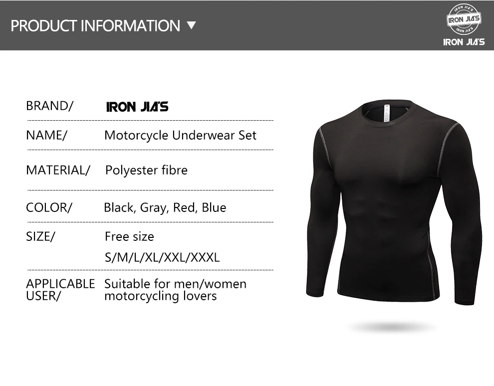 Особенности: ①POLYESTER ткань ②Отличная мобильность и впитывание влаги, сохраняя сухость и комфорт ③Уникальная Мягкая матовая задняя часть обеспечивает ультра-комфортное ношение ④Чрезвычайно мягкий и гладкий, легкий и абсолютно негромоздкий, антибактериальный, антистатический ⑤ Четырехсторонняя эластичная ткань для плотного прилегания, контролируемая усадка для длительного сохранения размера и формы ⑥Подходит для мотоциклов, велоспорта, катания на лыжах, альпинизма, кемпинга и пеших прогулок, легкой атлетики и активного отдыха Технические характеристики: Бренд: IRON JIA'S Состояние: абсолютно новый товар Цвет: красный, серый, черный, синий Материал: полиэстер Размер: S, M, L, XL, XXL,XXXL