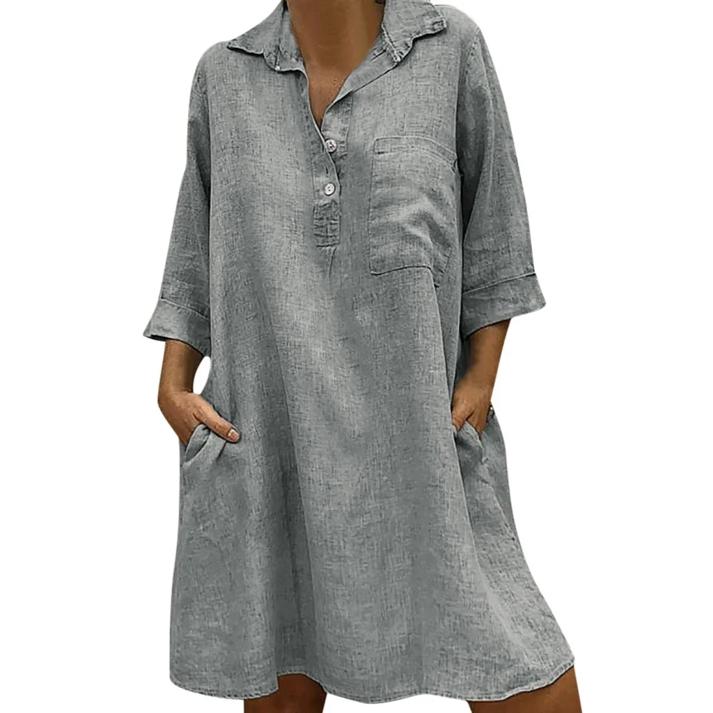 Женское платье, однотонное богемное платье с отложным воротником, рукав 3/4, Повседневное платье на пуговицах с карманами, женское свободное летнее платье Zomerjurk Dames