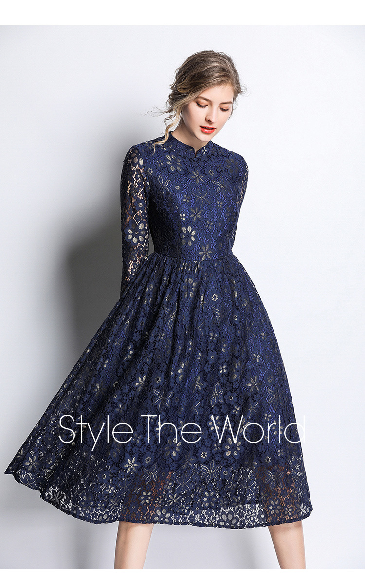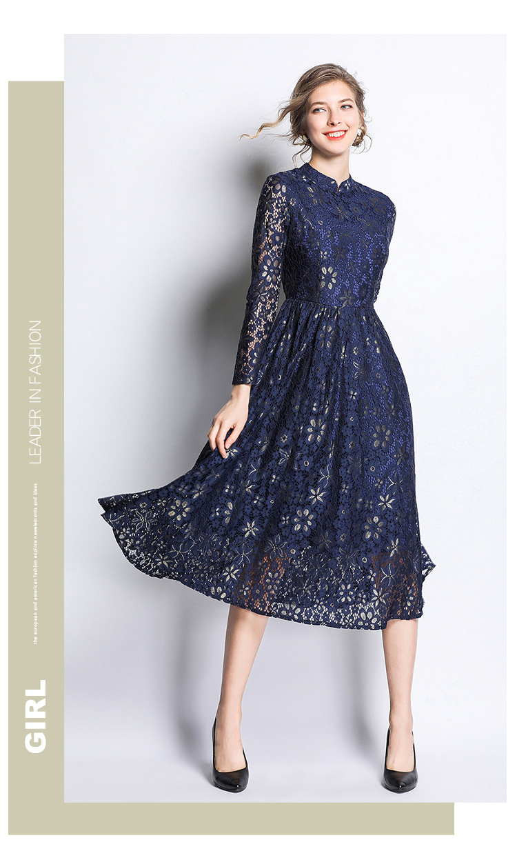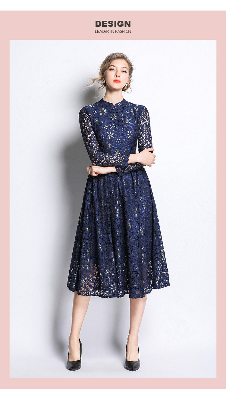 Элегантное открытое офисное повседневное винтавечерние платье 2019 Новое Женское кружевное платье с длинным рукавом тонкое модное красное синее платье высокого качества