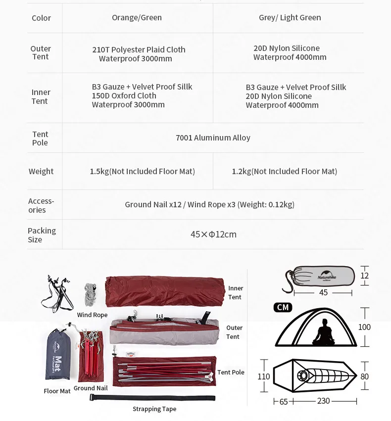 Внутренняя палатка: 20D нейлон с силиконовым покрытием + B3 дышащая сетка
