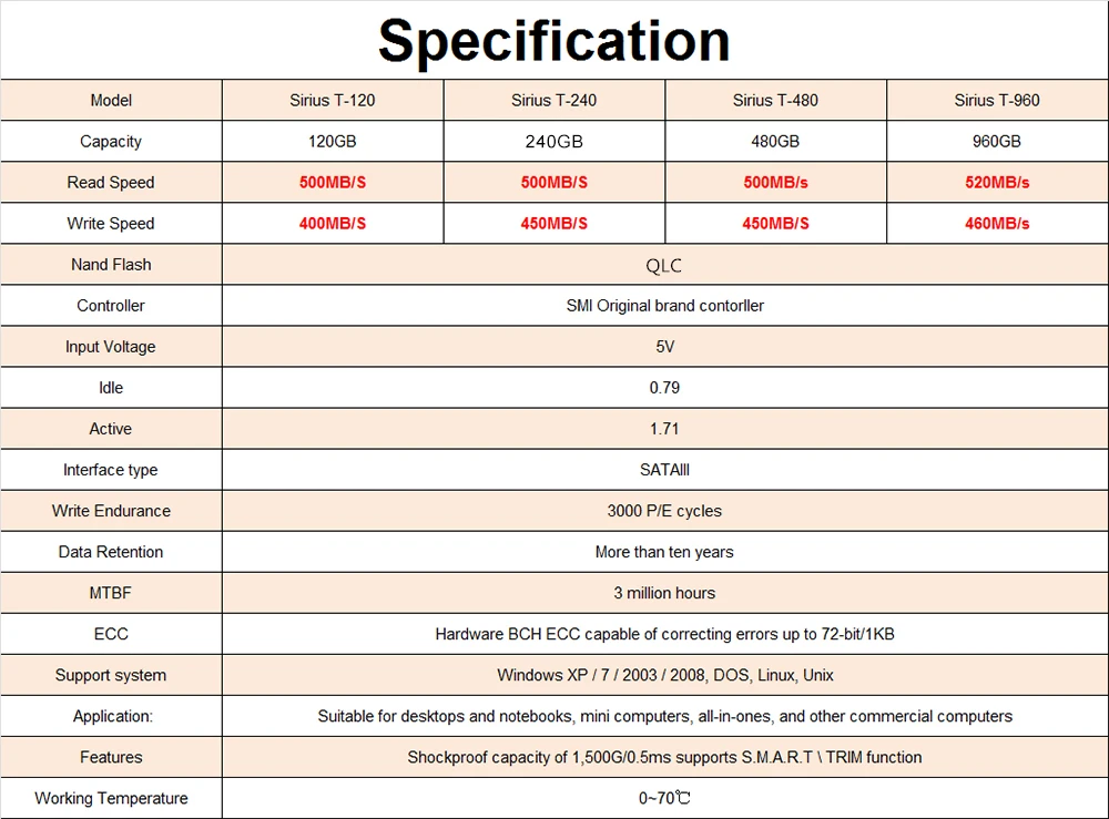 Модель: eeinno SSD 2,5 дюймов SATA3.0 Чтение/wiite: 500 МБ/с. (скорость чтения) / 450 МБ/с./с (скорость записи) Система поддержки: Window Vista,Window 7,8,10 ,Windxp ,Mac OS: 10,3, Ubuntu14,CentOS7 Срок службы хранения: более 10 лет Компоненты Nand: трехуровневая ячейка Nand флэш-память 1. Доступные емкости 120 ГБ, 240 ГБ, 2. 20 раз быстрее, чем традиционные жесткие диски (HDD) 3. Работает с настольными компьютерами или ноутбуками 4. 3 года ограниченной гарантии и бесплатная технологическая поддержка 5. Сертификация CE, FCC, ISO9001 6. Преимущества: высокая скорость, безопасность, бесшумный, стабильный, энергосберегающий 7. Рабочая температура: от 0 до 70 ℃ 8. Температура хранения: от-20 до 75 ℃