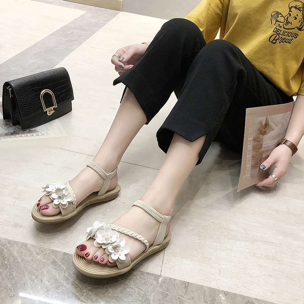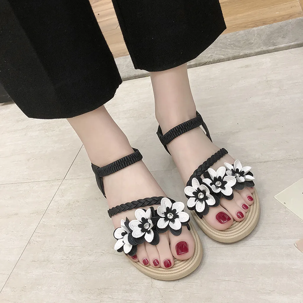 Женские сандалии на плоской подошве, розовые римские сандалии на плоской подошве, богемные пляжные сандалии с плетеными цветами, римская обувь