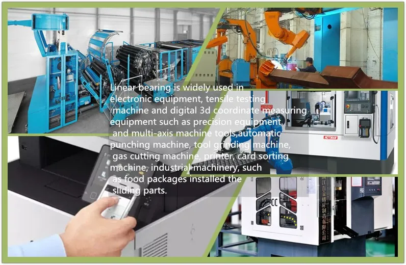 APPLICATION Linear bearing is widely used in electronic equipment, tensile testing machine and digital 3d coordinate measuring equipment such as precision equipment, and multi-axis machine tools,automatic punching machine, tool grinding machine, gas cutting machine, printer, card sorting machine, industrial machinery, such as food packages installed the sliding parts.