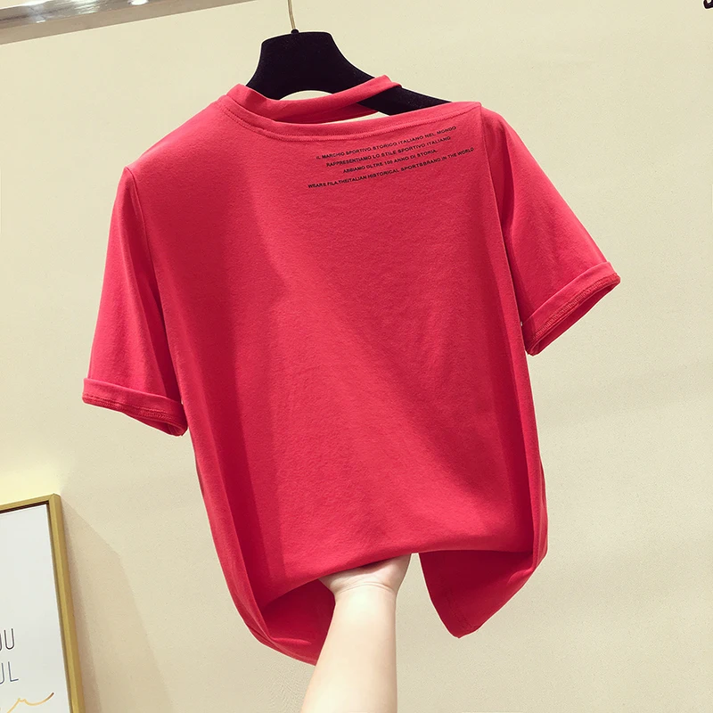 Женская футболка, весна-лето, новинка, Корейская, расшитая бисером, с черными буквами, с открытыми плечами, с кружевным воротником, хлопок