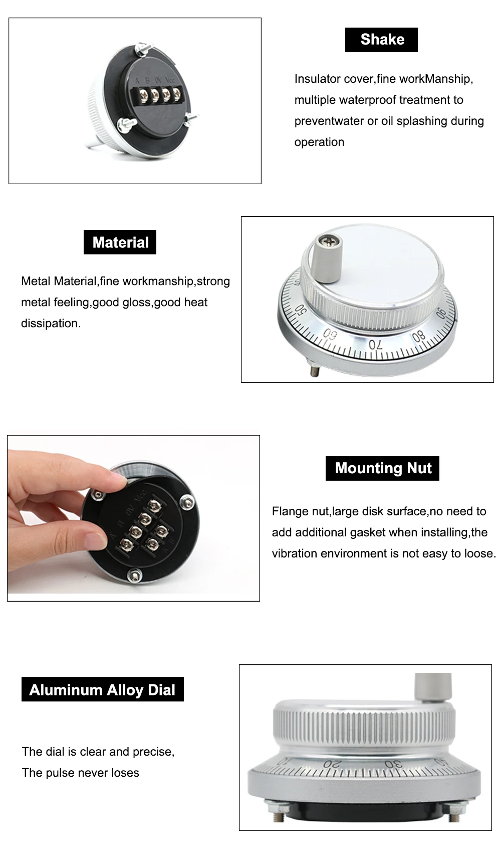 Диаметр: 60/80 мм 4Pin маховик: VCC, 0V, A, B 6Pin маховик: VCC, 0V, A, B, -A, -B Маховик ПЛК: VCC, 0V, A, B напряжение: 24V 100 импульсов выход: NPN Напряжение: обычно система чпу: 5 В Mitsubishi CNC система: 12V двойное напряжение Напряжение ручного колеса ПЛК: 24 В Импульсы: 100 импульсов/25 импульсов Применение: Нулевая регулировка и сегментация сигналов системы ЧПУ с числовым управлением и различные положения управления механическим оборудованием, таким как: токарные станки с ЧПУ, шлифовальные станки с ЧПУ, фрезерные станки с ЧПУ, гравировальные станки, обрабатывающие центры, печатные машины, И так далее