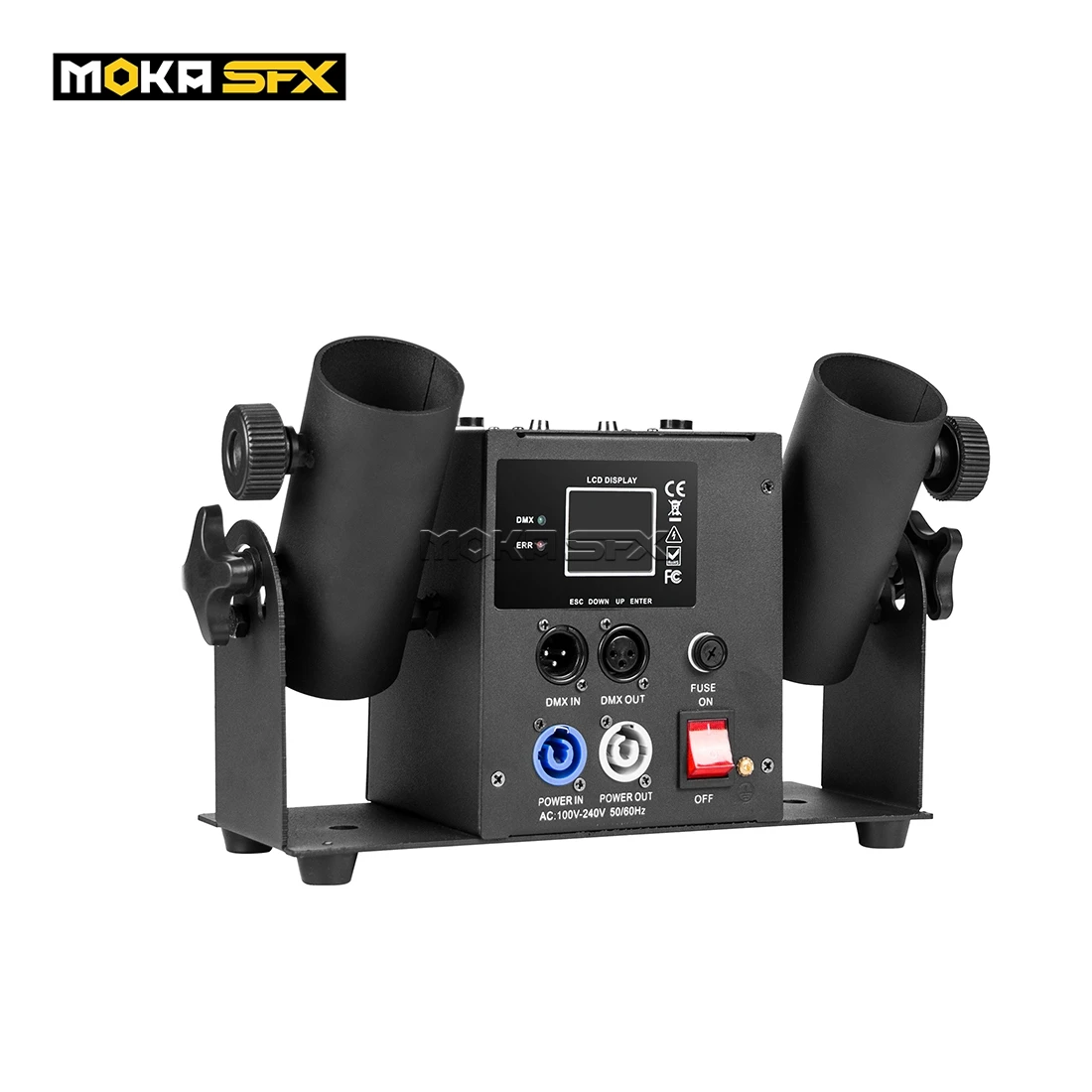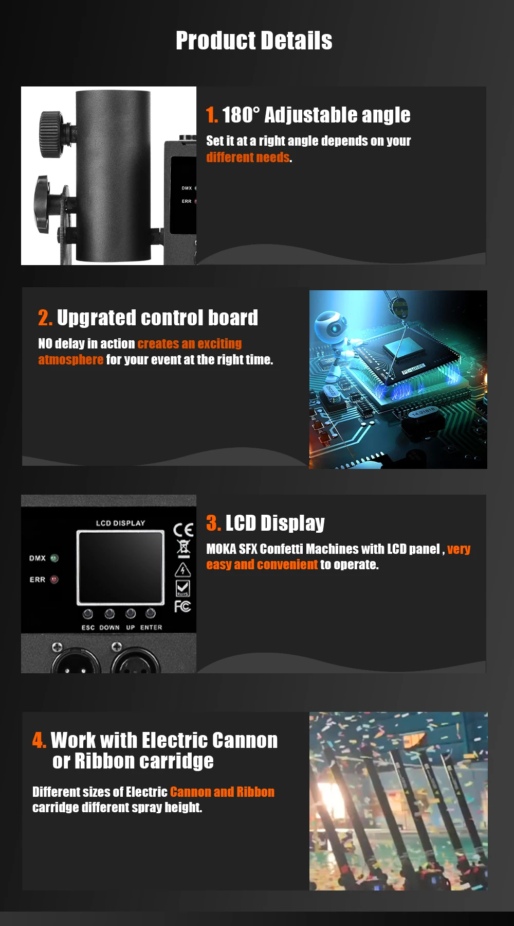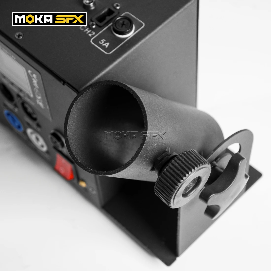 A: в верхней части устройства есть 4 электрические кабельные розетки конфетти, когда вы подключаете конфетти с гнездами, вы можете сделать съемку по одному нажатием на сценический светильник-контроллер канала 1 на канал 6.