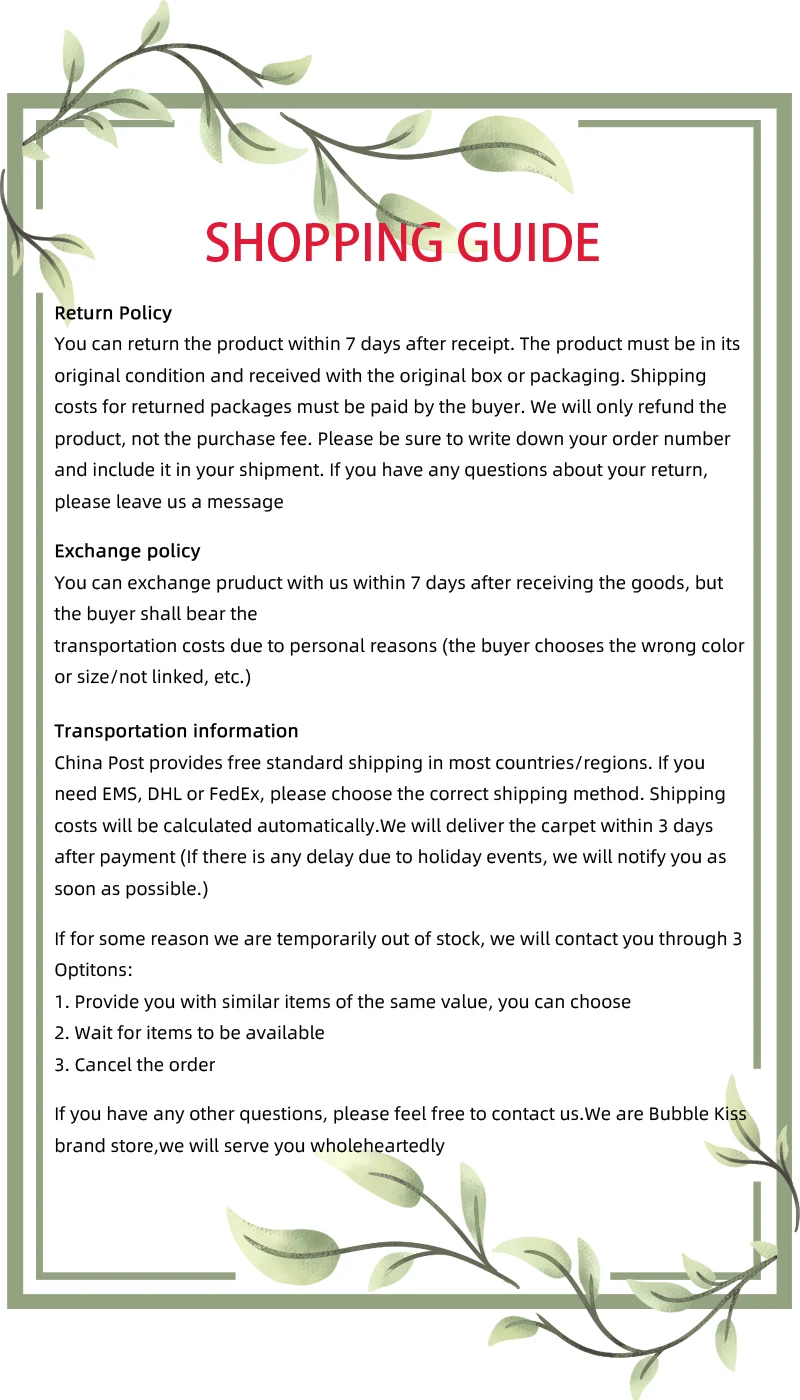 В: есть ли у вас действительно фото? О: Да, если вы хотите просмотреть реальные фотографии, пожалуйста, свяжитесь с нами! Мы предоставим вам позже. В: Можно ли сделать заказ? Ответ: Да, если вам нужна Настройка, пожалуйста, свяжитесь со службой поддержки клиентов В: это не скользит? О: Да, нижняя часть ковра-Нескользящая пластиковая подошва В: если вам это не нравится, как мне его вернуть? Ответ: если покупатель возвращает товар в течение 15 дней после получения товара по какой-либо причине, мы вернем покупателю деньги. Однако покупатель должен оплатить стоимость обратной доставки и убедиться, что возвращенный товар остается в первоначальном состоянии. В: какая логистика используется для доставки? О: товары отправляются по AliExpress стандарту, Почта Китая авиапочтой, AliExpress экспресс-почтой, ePacket и прибывают в большинство стран в течение 15-35 рабочих дней. Время доставки зависит от пункта назначения и других факторов, это может занять до 60 рабочих дней. Если вы хотите получить продукцию быстрее, пожалуйста, свяжитесь с нами, чтобы оплатить дополнительную стоимость доставки, мы можем предоставить вам следующие более быстрые и дешевые методы доставки: UPS, DHL, Fedex, TNT, DEPX, EMS. Таким образом, вы можете получить товар в течение 5-7 рабочих дней.
