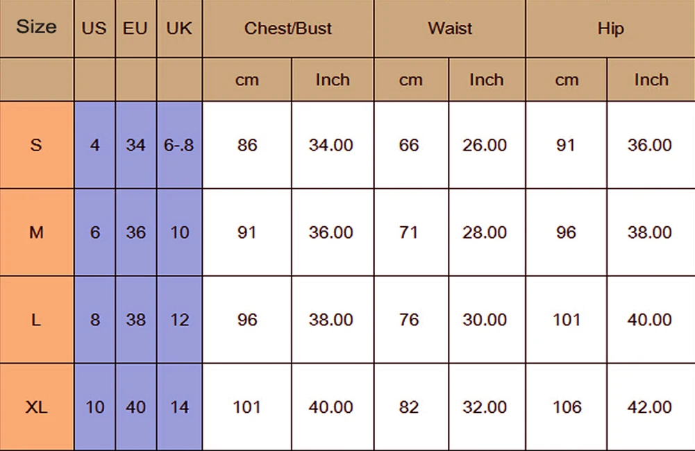 Разница в 2-3% в соответствии с измерениями вручную. 1 дюйм = 2,54 см Обратите внимание, что небольшая разница в цвете может быть допустима из-за освещения и экрана. В комплект входит:1х женское платье